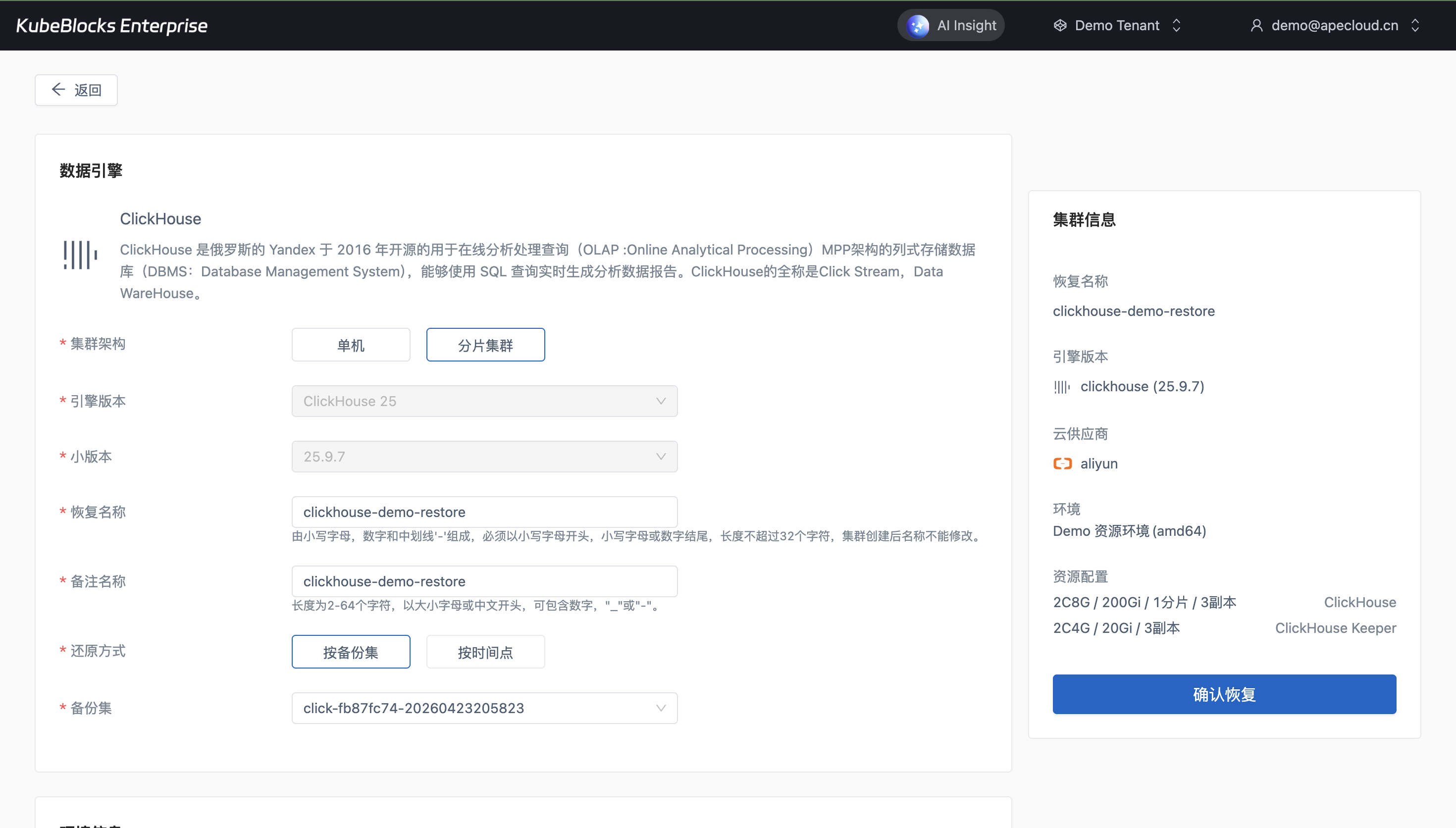 ClickHouse 页面已经展示仓库、策略和恢复流程,让分析型数据保护与恢复验证保持在同一工作区中完成。