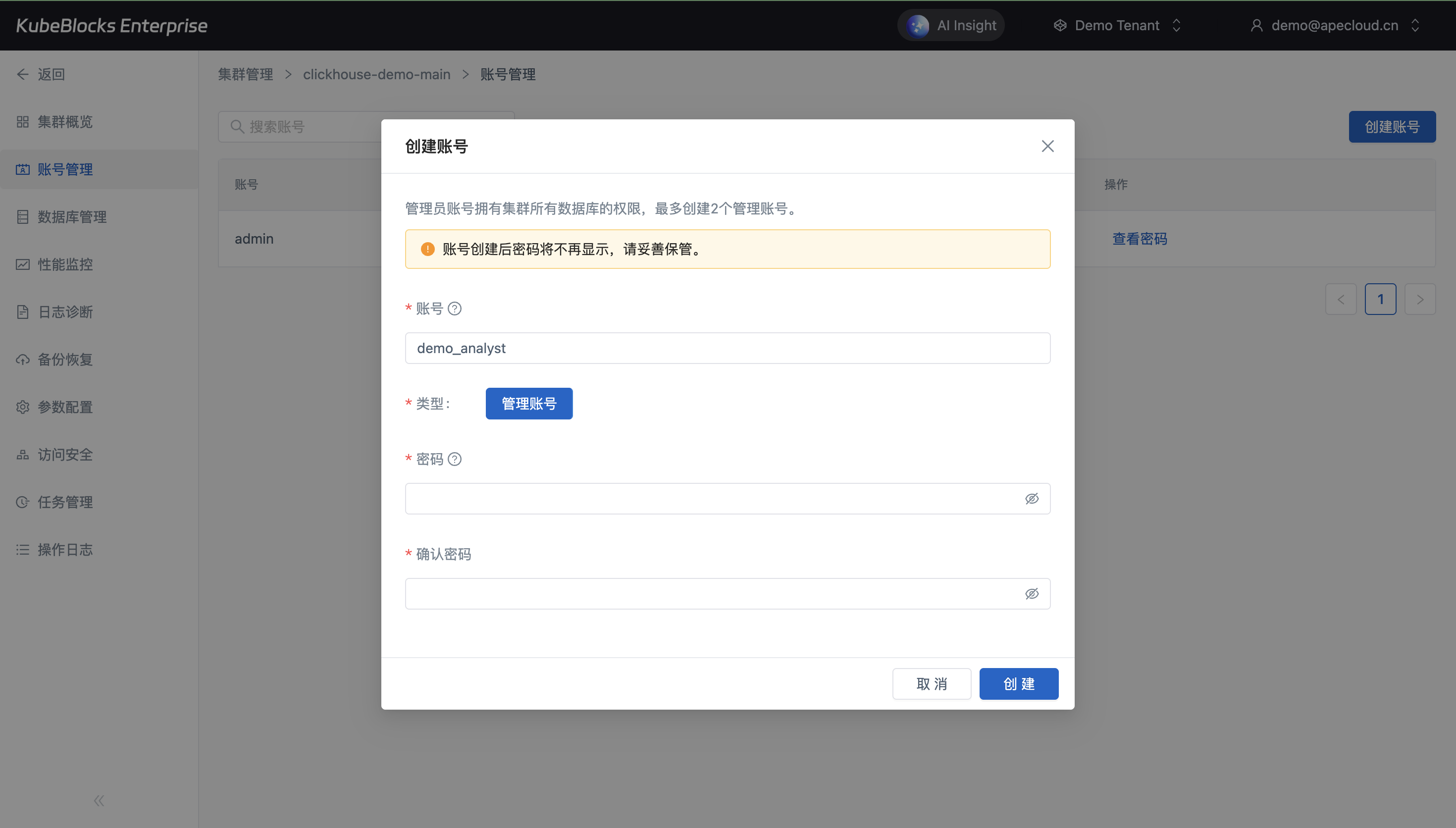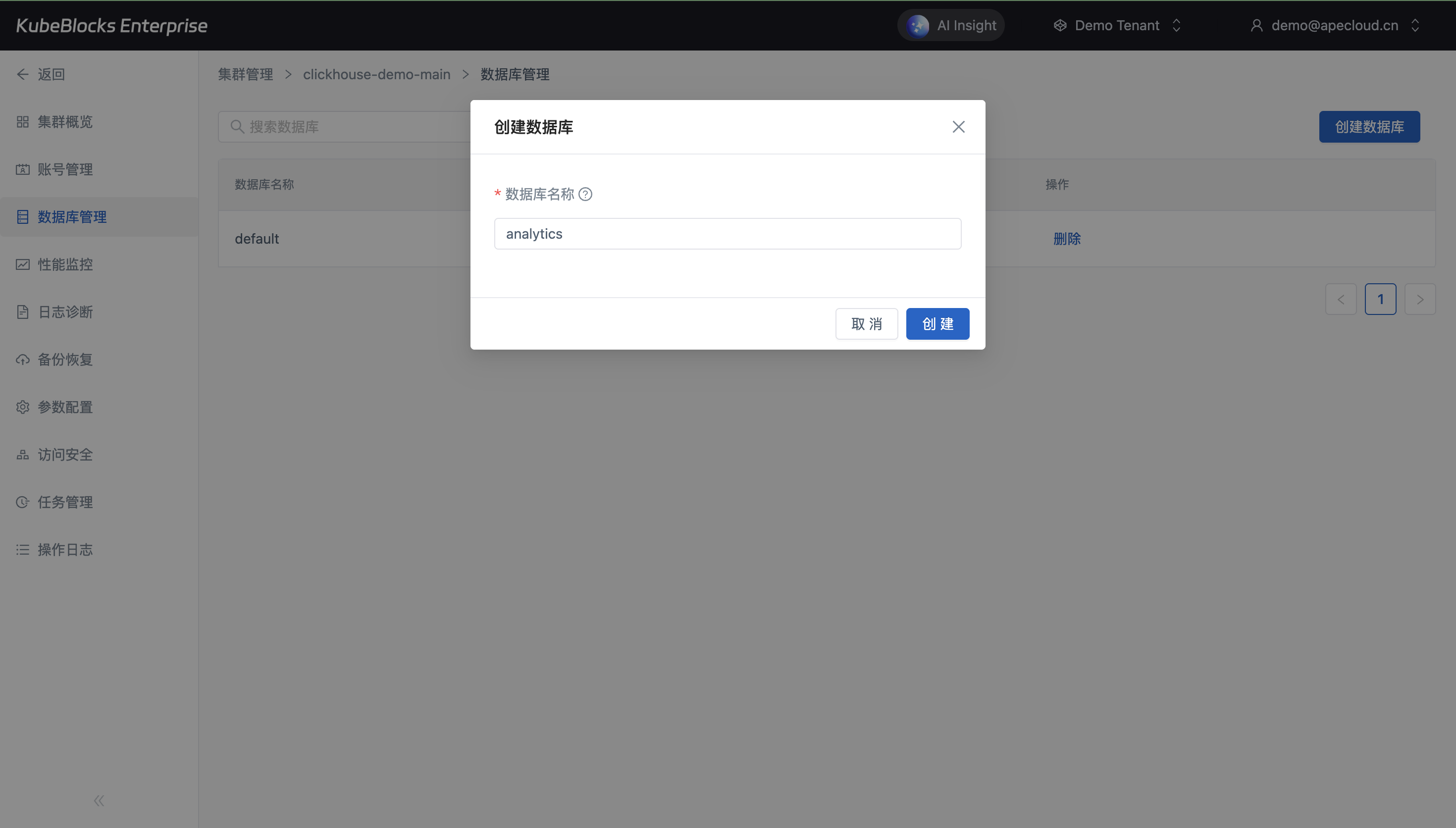 ClickHouse Addon 通过数据库和账号页承接数据管理入口,让平台团队可以围绕分析型服务的接入做集中治理。