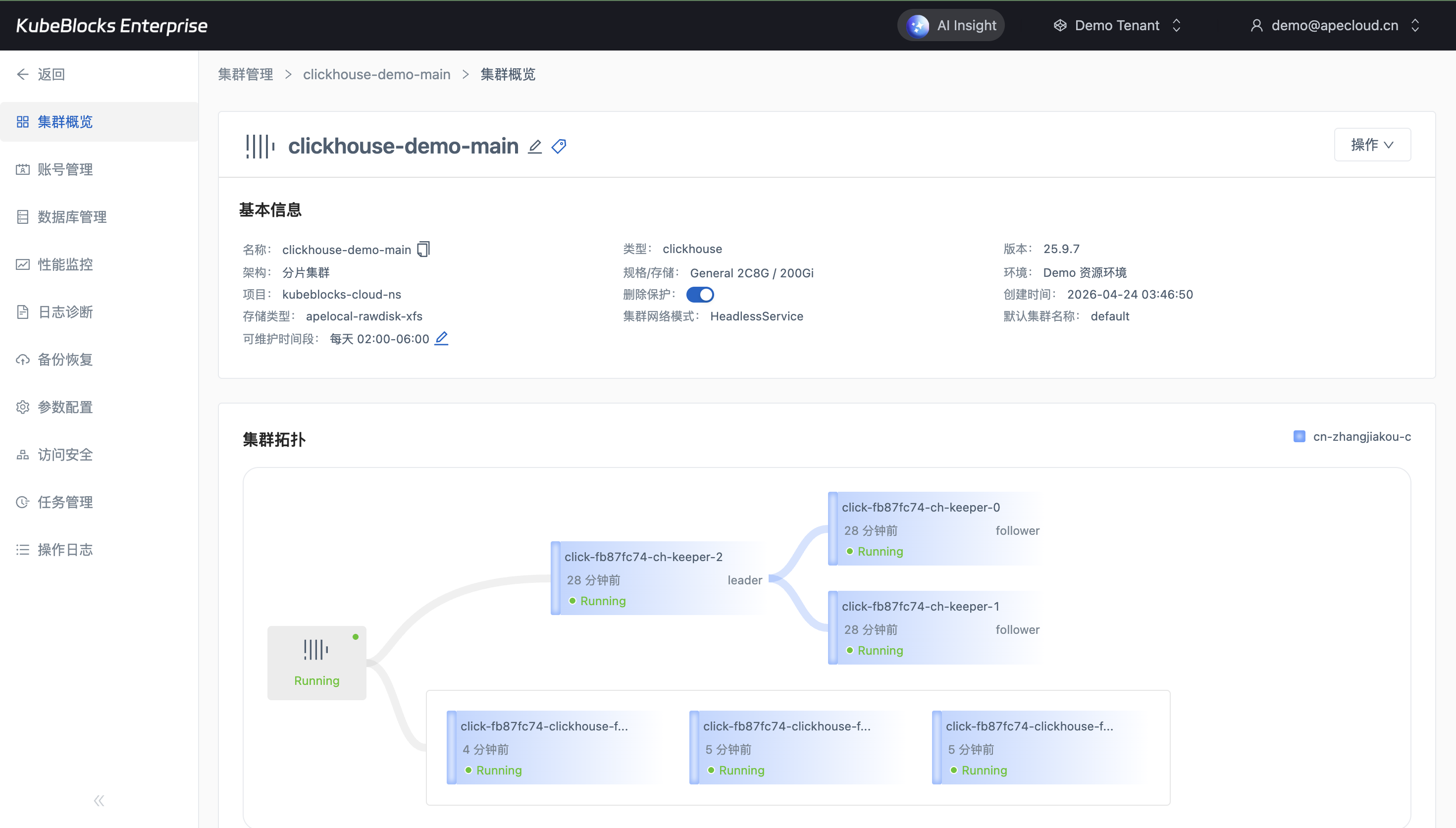 ClickHouse Addon 将创建向导和概览页留在同一工作区中,让分析型数据库的交付与日常巡检保持一致入口。