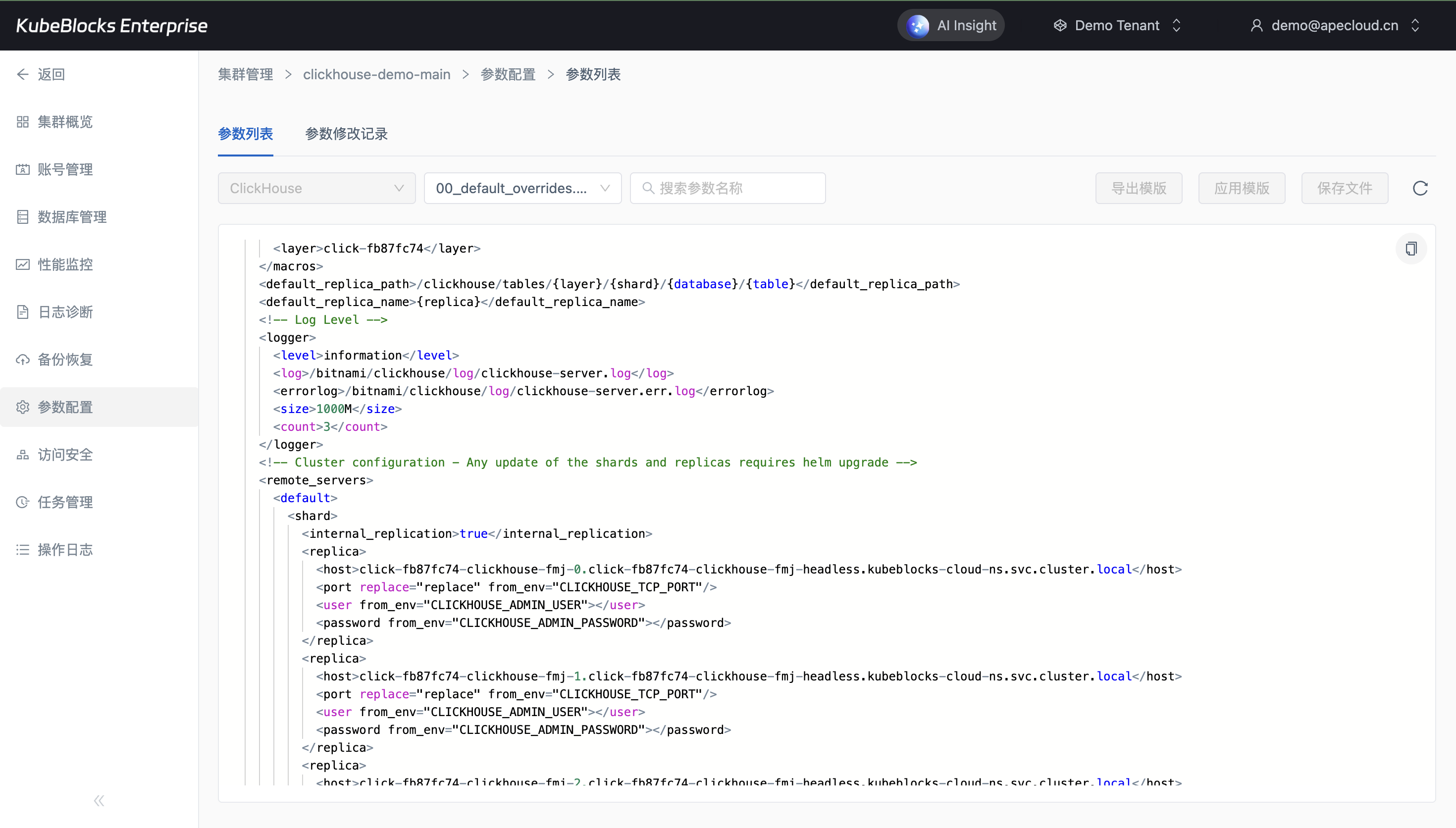 参数配置页面已经把 ClickHouse 原生参数独立出来,适合围绕执行引擎和运行时配置做集中治理。