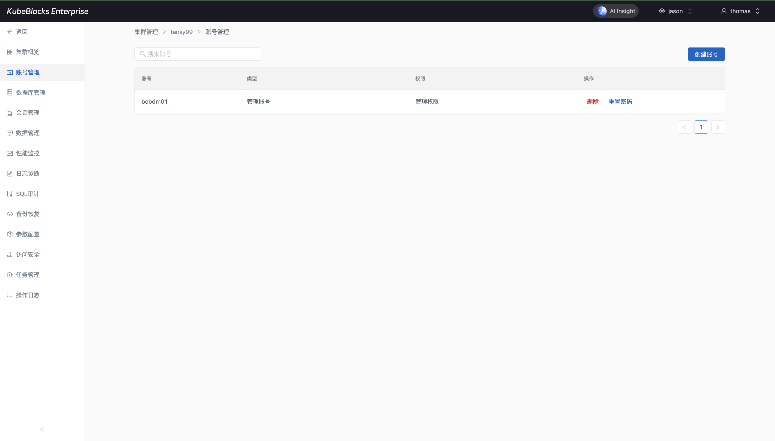 账号页和数据库页把访问主体与逻辑库对象留在同一工作区中,便于围绕应用接入做受控交付。