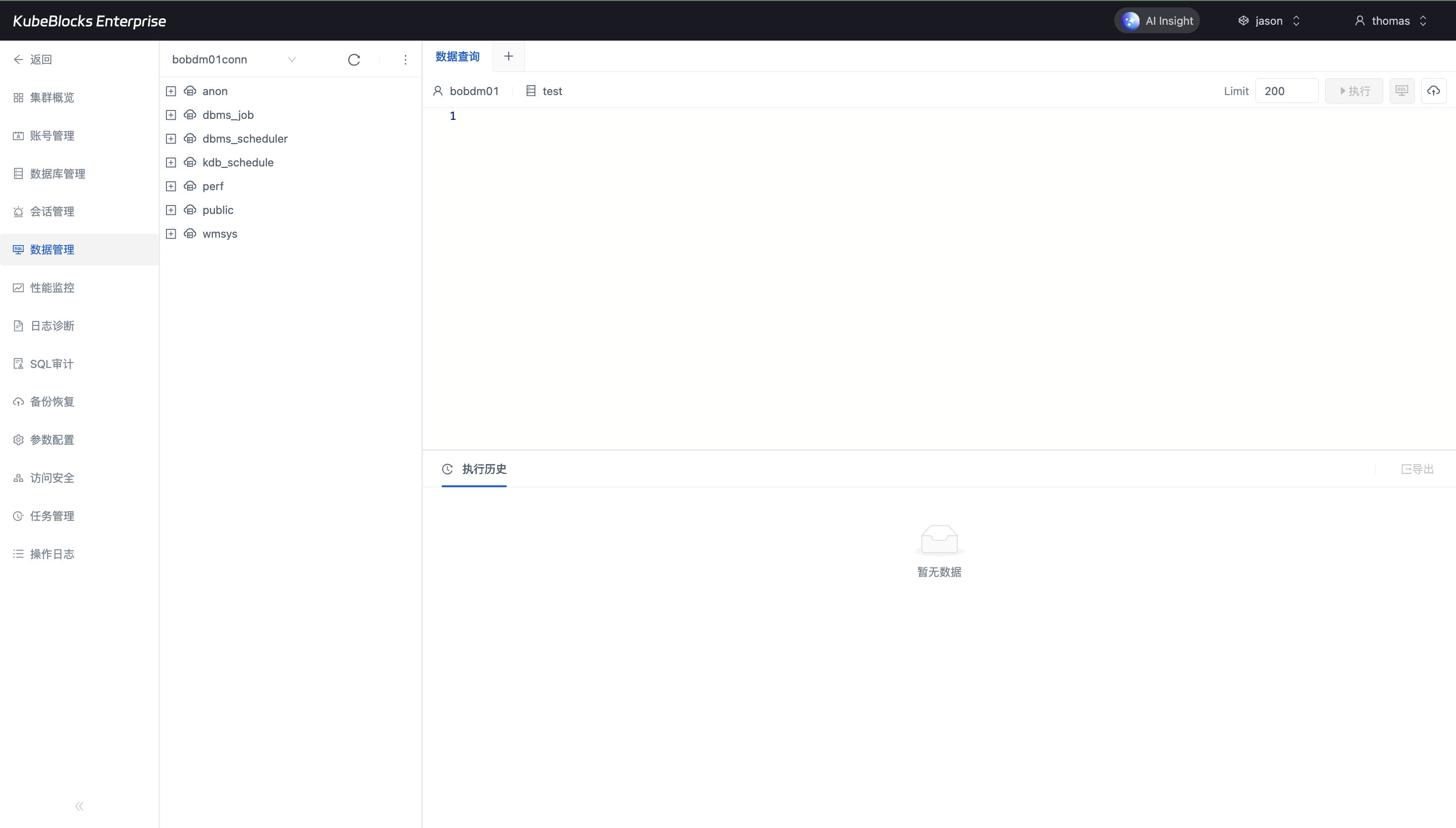 金仓 Addon 将会话管理和 Data Management 查询工作台放在同一数据管理入口中,让平台团队可以同时观察连接活动并验证 SQL 访问能力。
