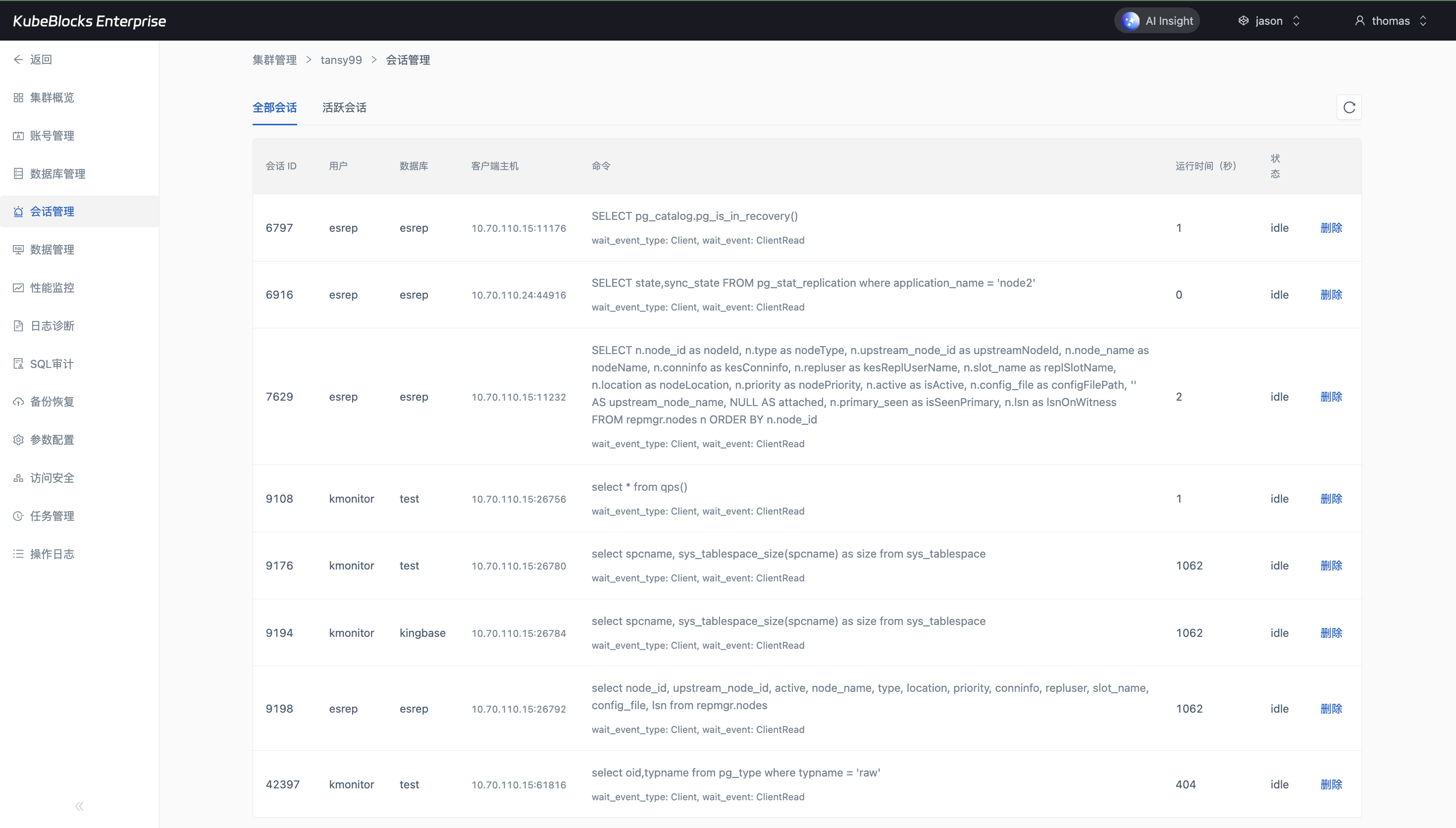 会话管理页面帮助团队观察当前连接活动,让实例使用状态更具象。