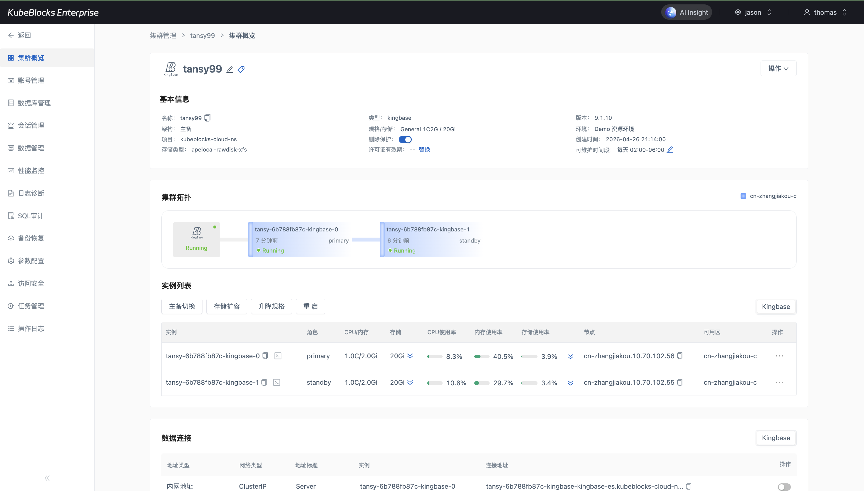 金仓 Addon 将创建向导和概览页留在同一工作区中,让平台团队在交付阶段一次性确认版本、拓扑、资源与连接入口,并把后续巡检继续留在同一上下文里。