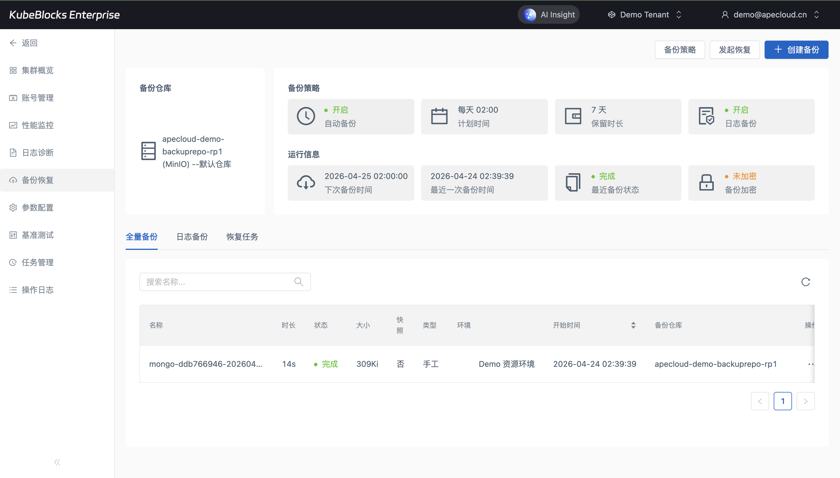 MongoDB Addon 将 PBM 物理备份记录和恢复向导留在统一工作区中,让团队围绕保护点、仓库和恢复目标完成闭环管理。