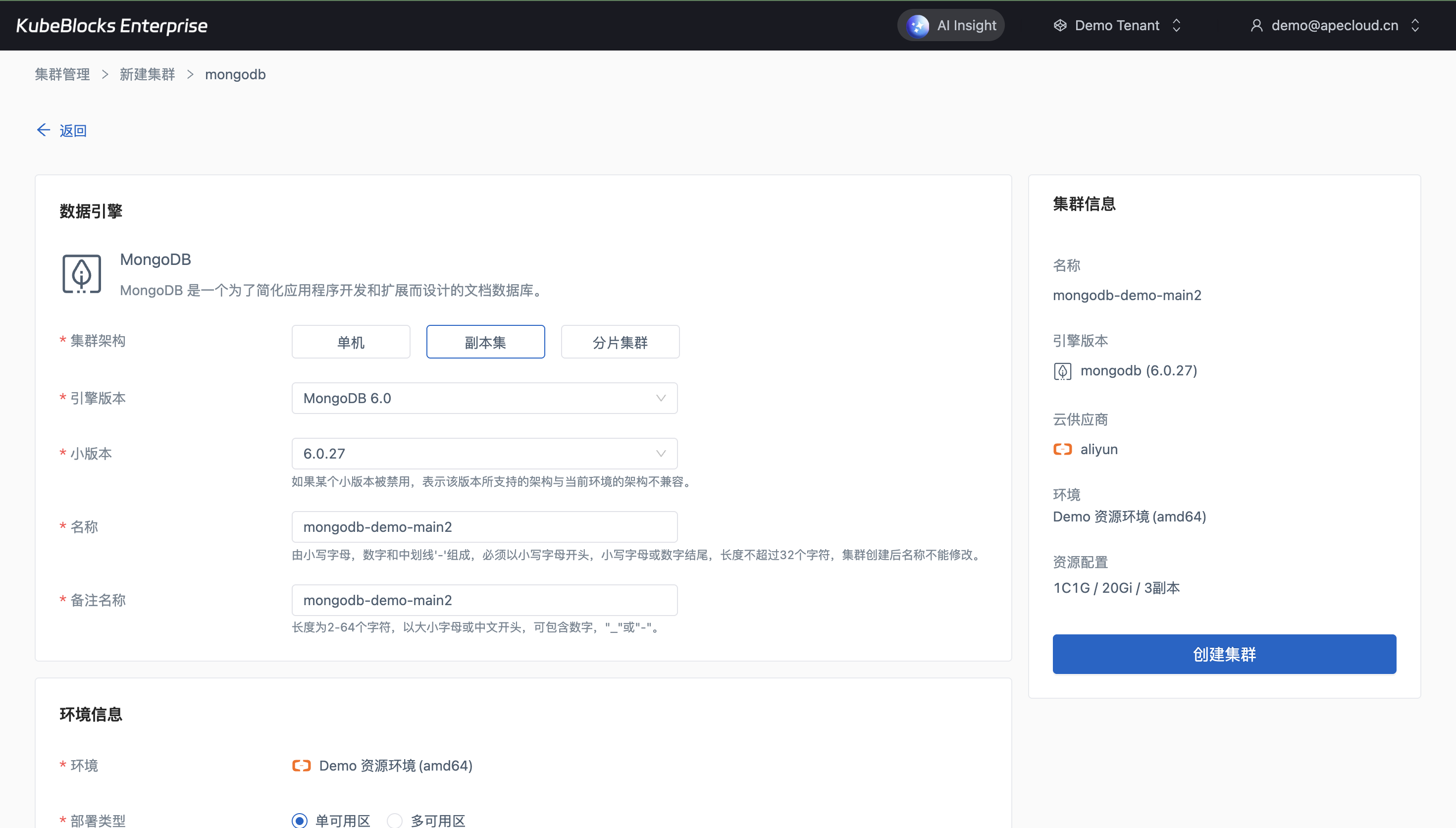 创建向导直接展示 MongoDB 版本、部署形态和节点规模。