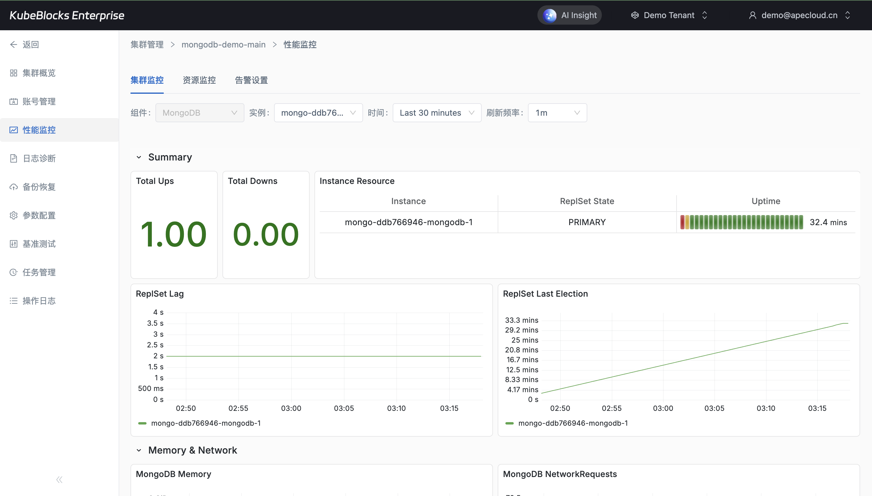 监控页同时呈现副本集健康、延迟和节点资源指标。