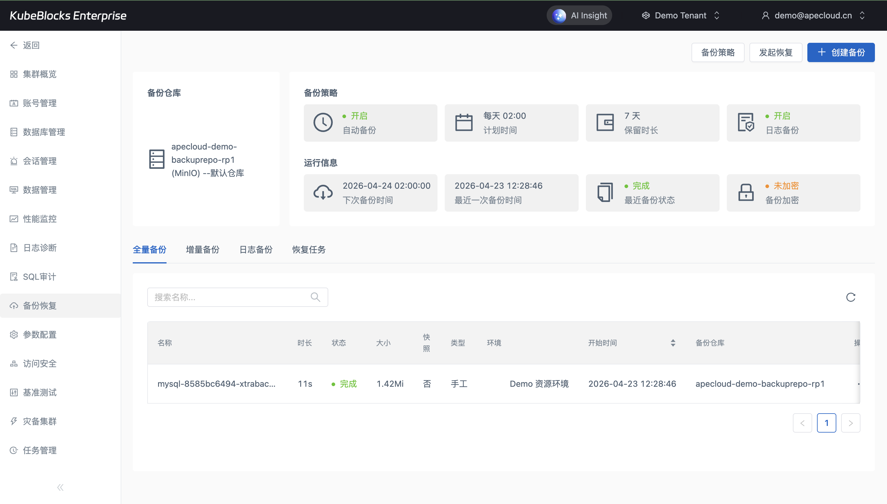 将备份策略、任务进度和恢复入口与正在运行的 MySQL 服务保持在同一工作区中,让保护、验证和恢复形成闭环。