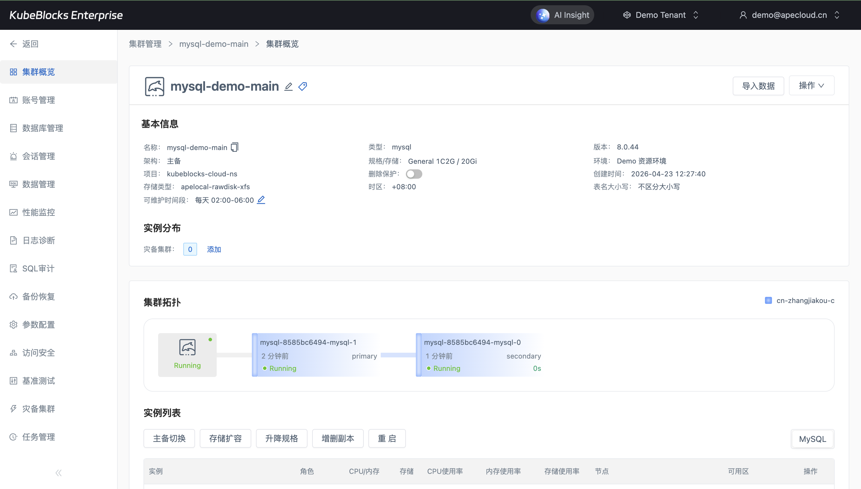 通过同一个工作空间完成 MySQL 集群创建与概览巡检,把版本、拓扑、计算资源、存储和备份策略集中在统一入口里管理。