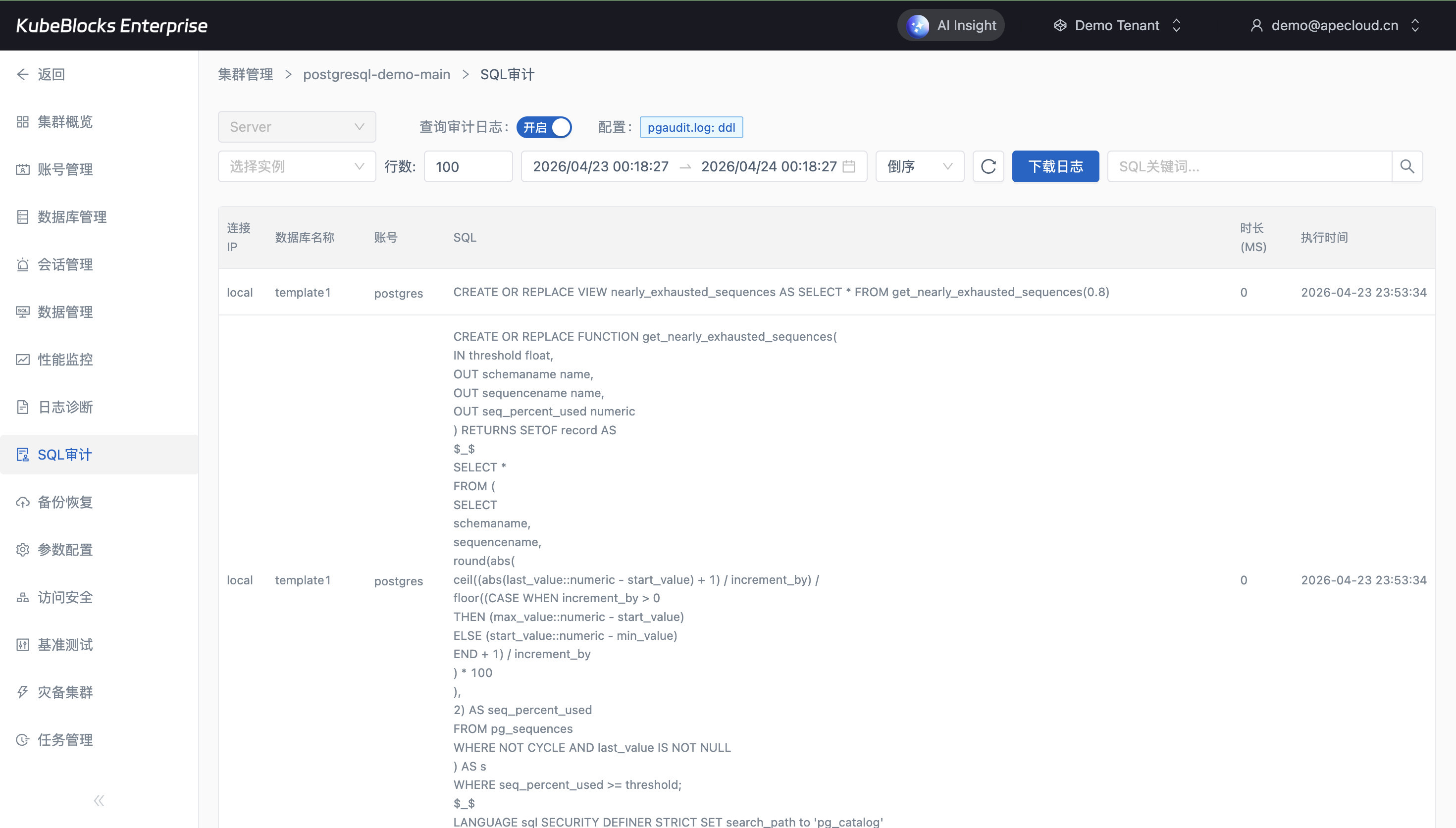 SQL Audit 与 Tasks 页共同构成数据库变更和运维操作的回看证据链,让平台团队能够快速回答语句执行和任务变更的来源、时间与结果。