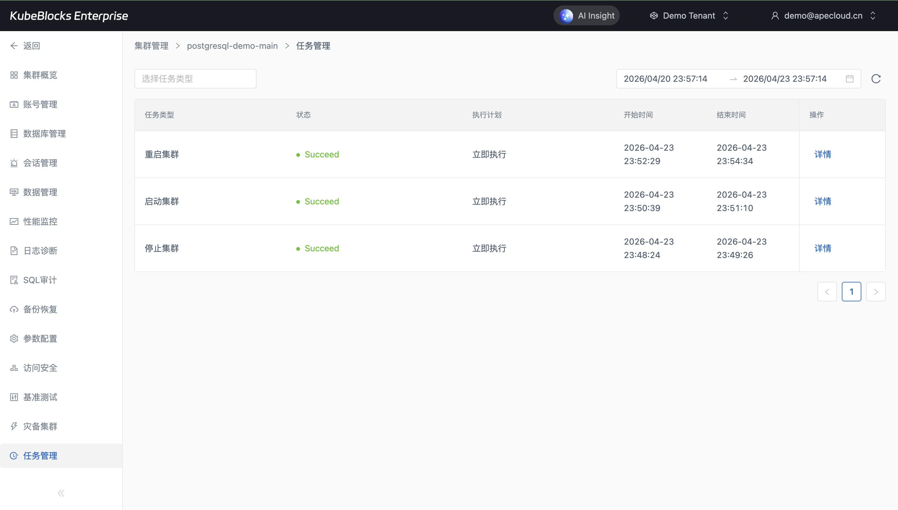 Tasks 页面沉淀扩缩容、切换、备份和恢复等运维动作,便于统一回看。