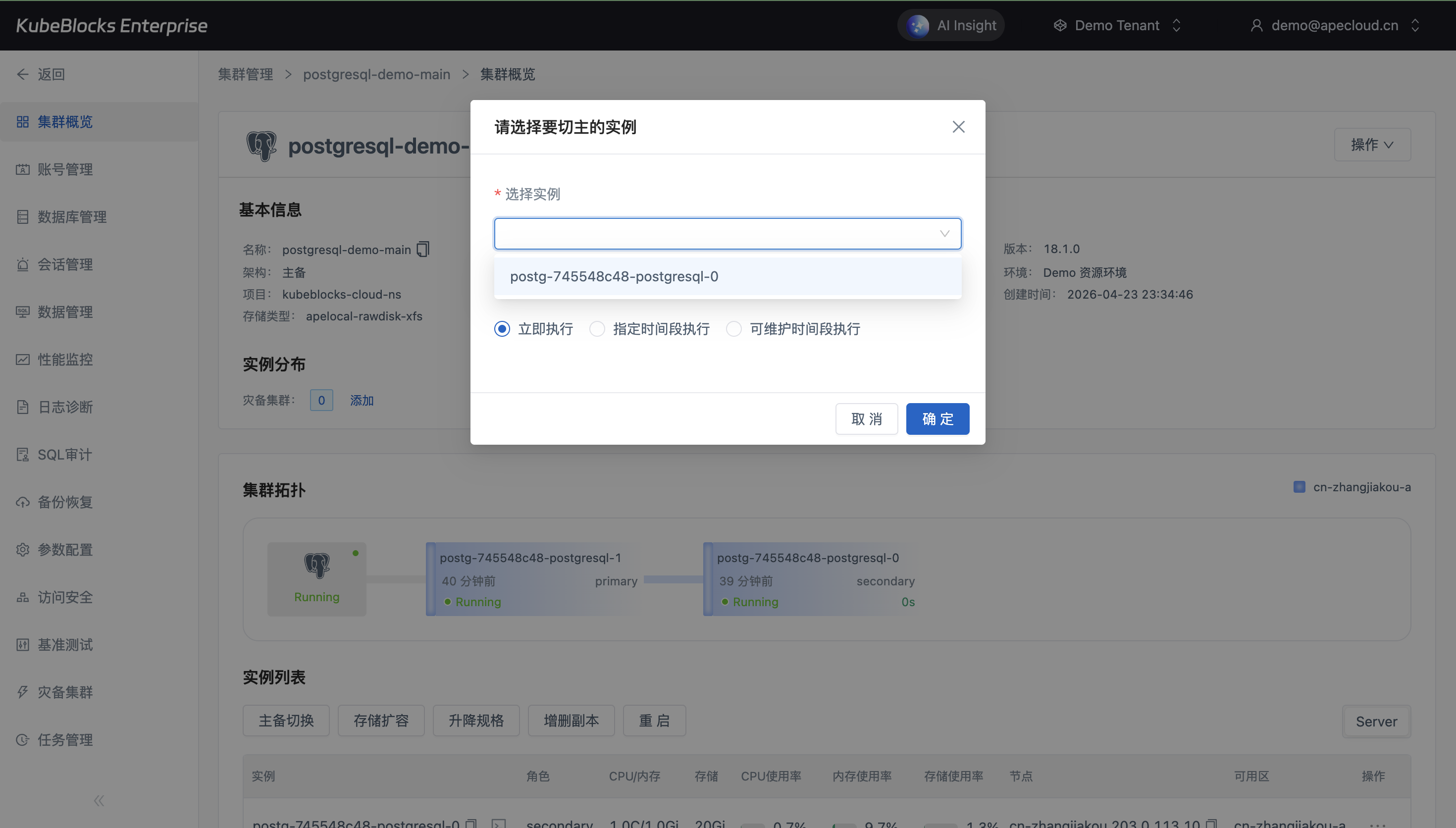 PostgreSQL Addon 提供计划内 Switchover 流程,让平台团队在控制台中完成主备角色切换并直接核对切换结果。