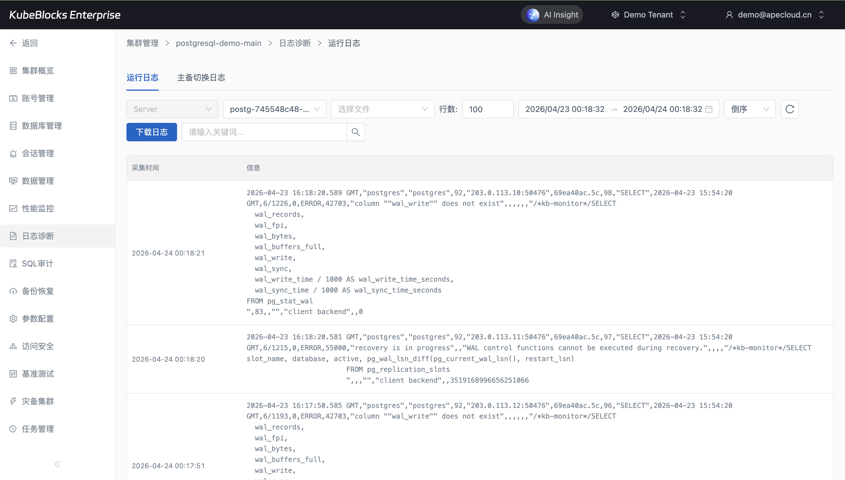 PostgreSQL Addon 将性能监控和日志定位保留在统一工作区中,帮助平台团队持续观察数据库健康度并缩短故障定位路径。
