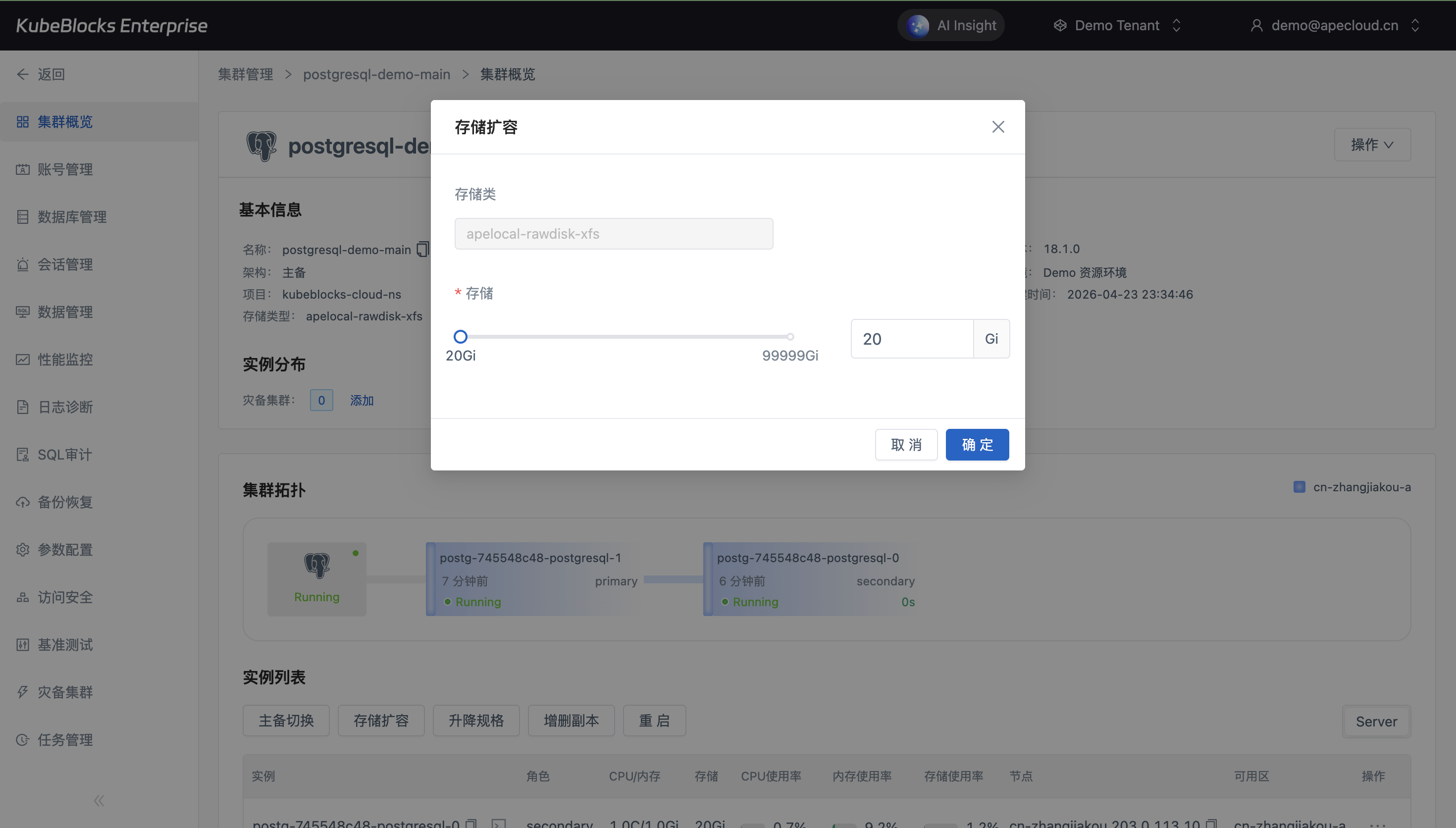 PostgreSQL Addon 将升降规格和存储扩容拆解为明确的专用流程,在提交变更前清楚展示目标配置和容量变化。