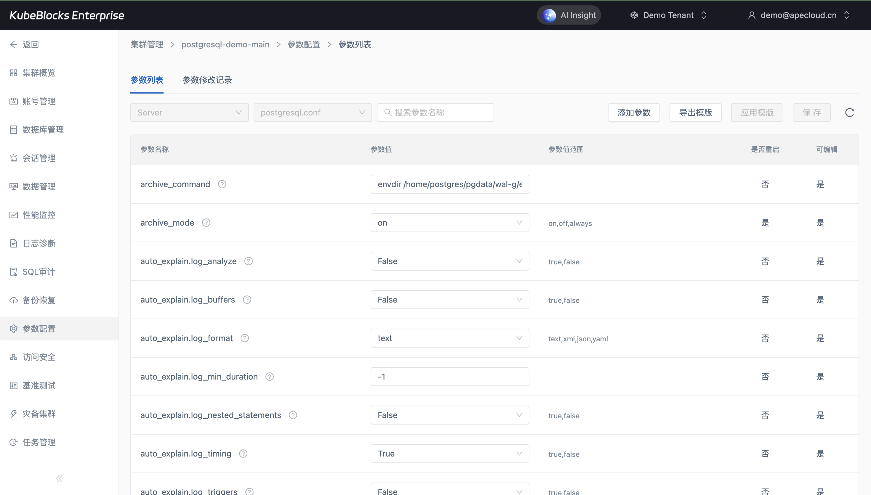 参数配置页面集中展示 PostgreSQL 原生参数与当前值,方便团队围绕连接、WAL 和复制行为等关键配置执行在线调优。