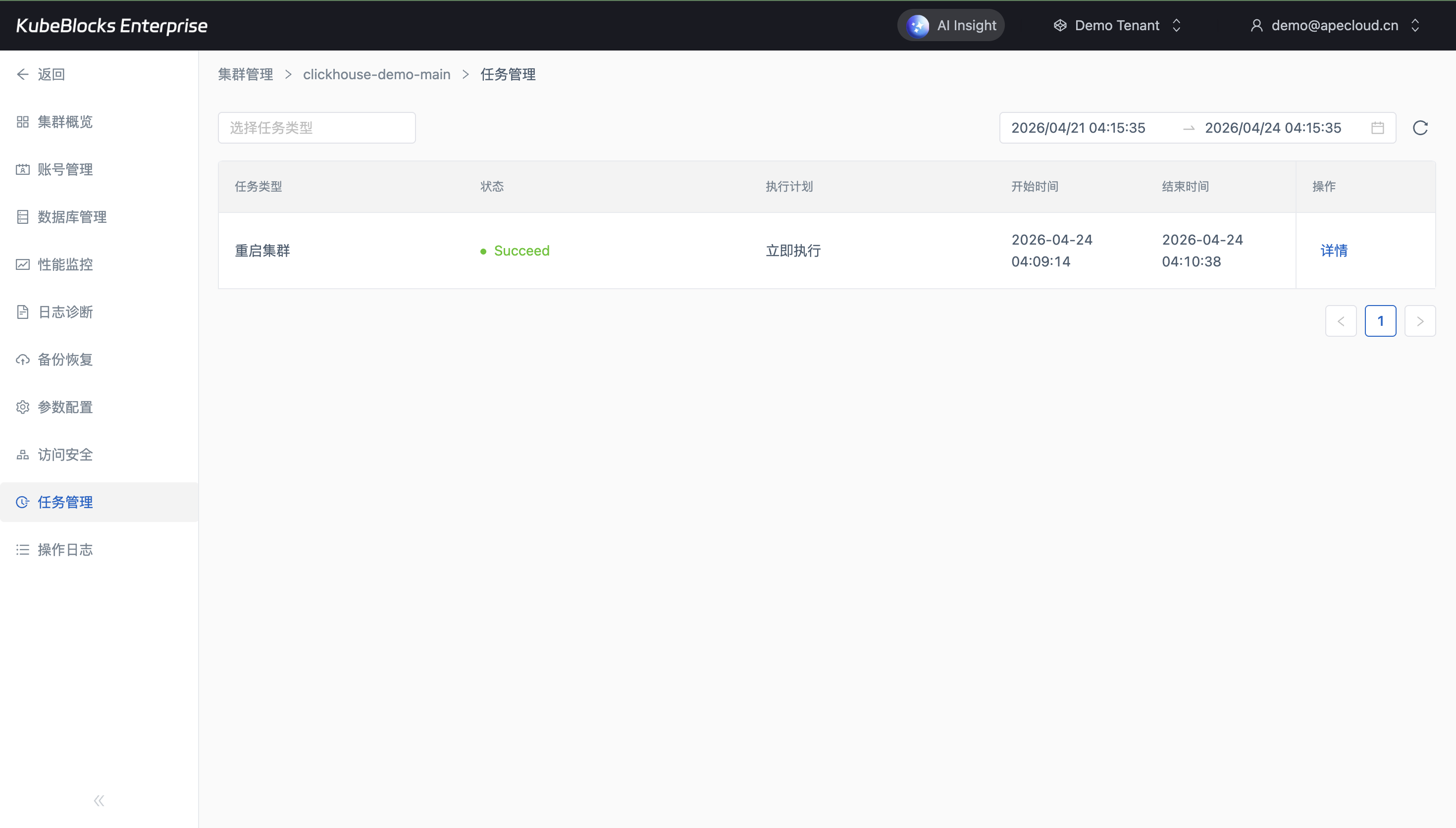 ClickHouse Addon 将任务历史沉淀在控制台中,适合回看生命周期和容量调整等执行记录。