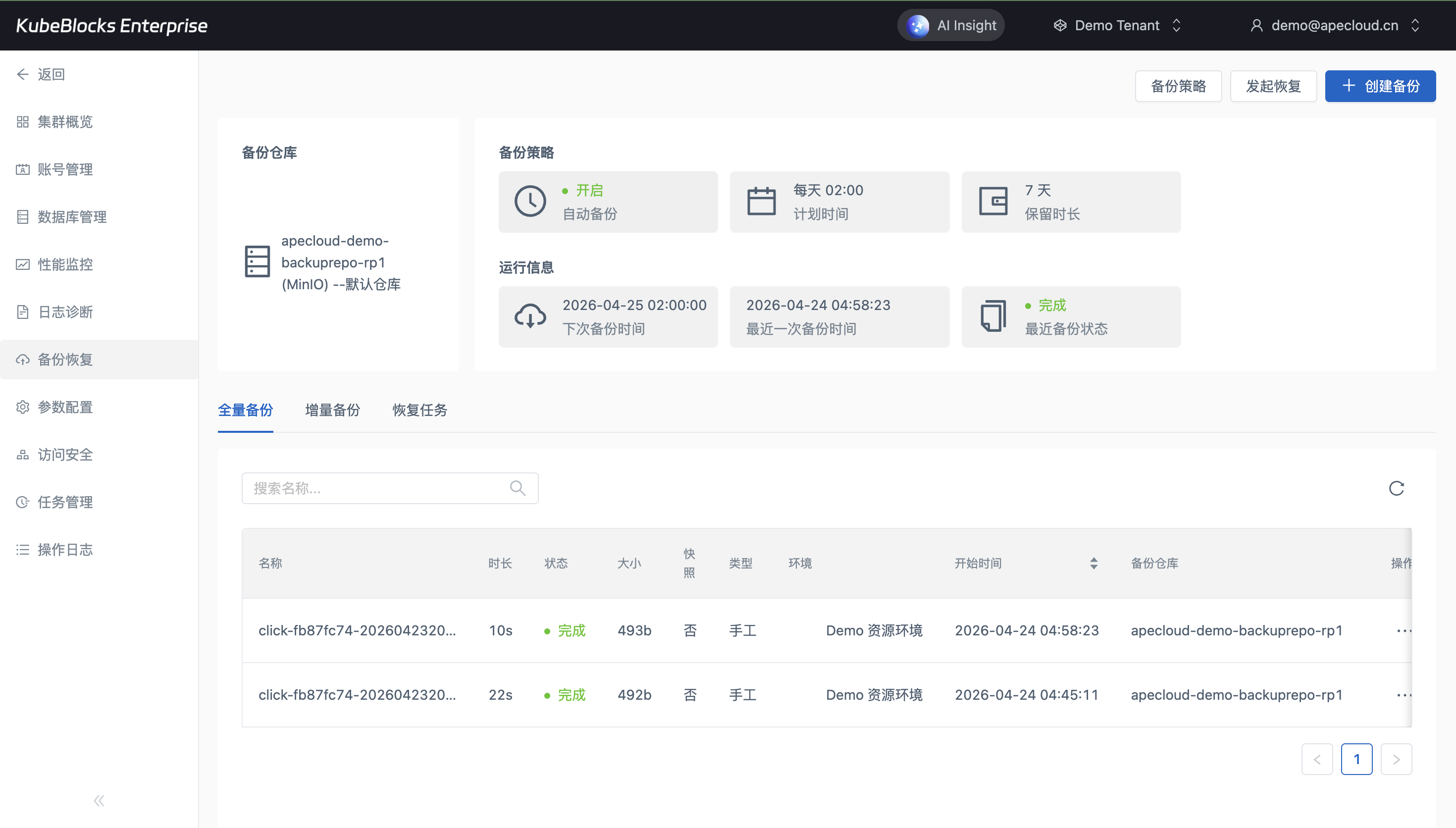 备份恢复入口与交付和扩容入口并列呈现,便于统一管理保护点。