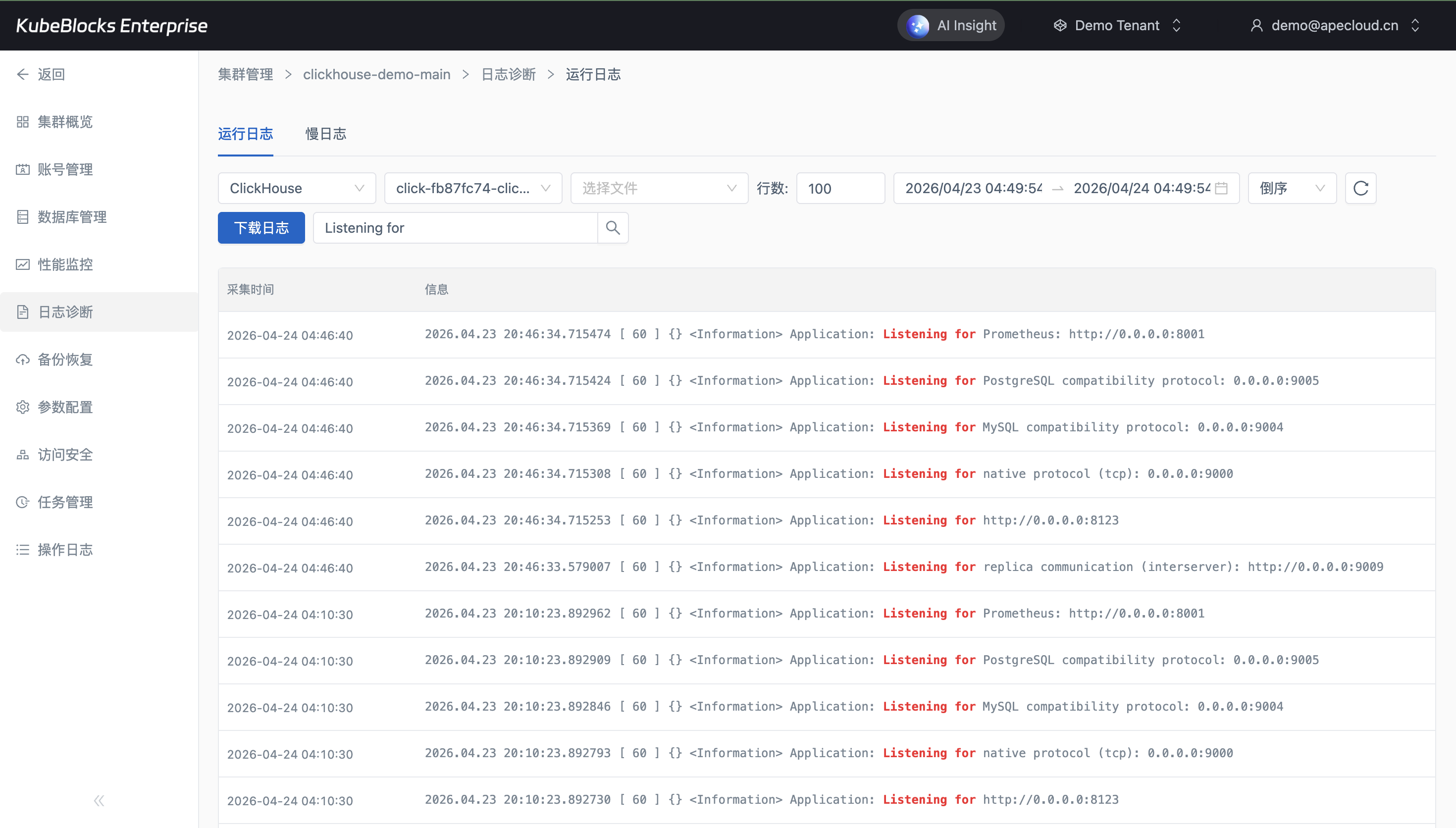ClickHouse 页面已经提供指标和日志两类运行证据,便于围绕分析型服务状态做持续巡检与问题定位。