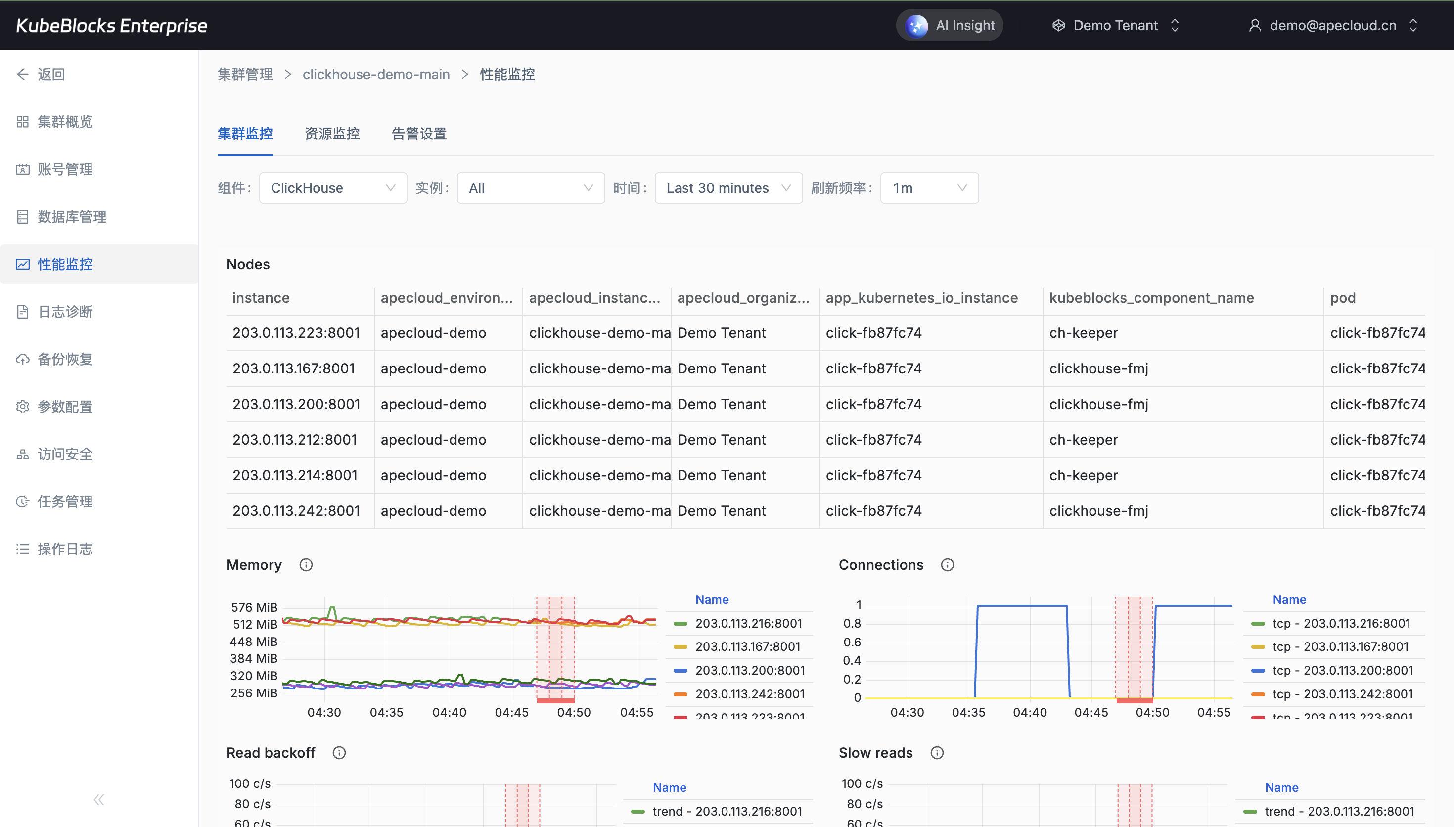 监控页持续展示 ClickHouse 关键性能与资源指标。