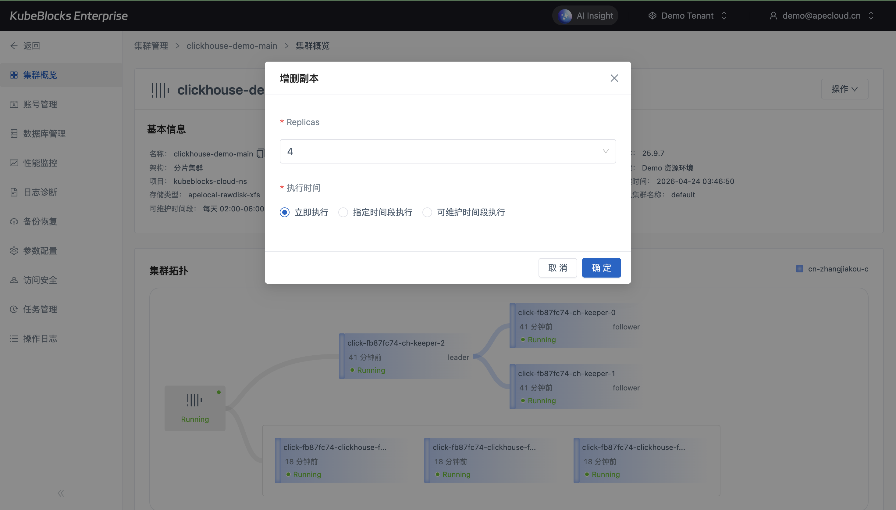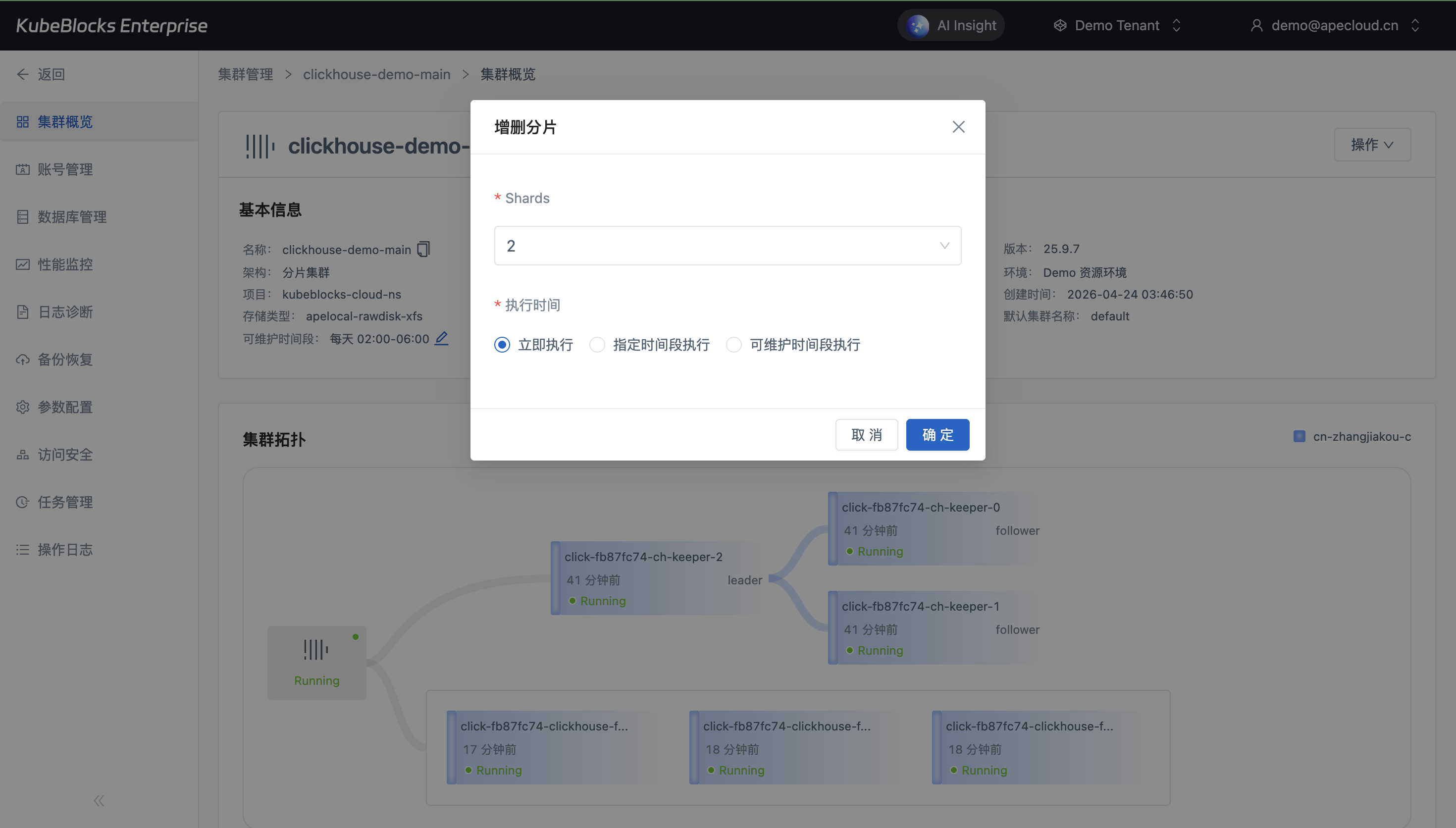 ClickHouse Addon 将分片扩展和副本扩展拆成独立操作入口,适合围绕分析负载增长做横向扩展。