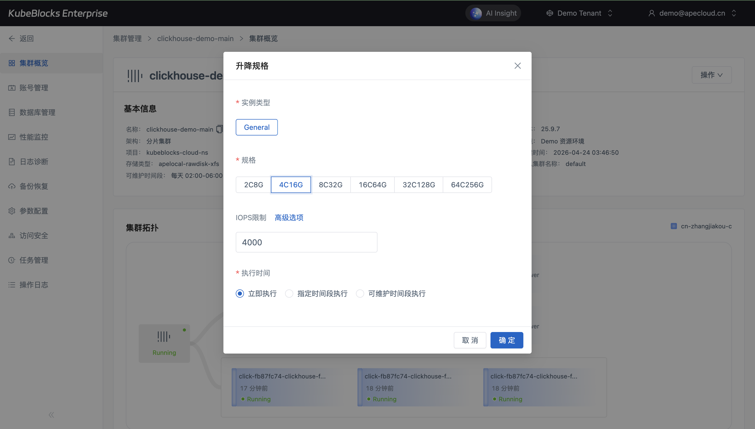 Vertical Scaling 展示目标 CPU 和内存配置,便于分析型数据库资源调整。
