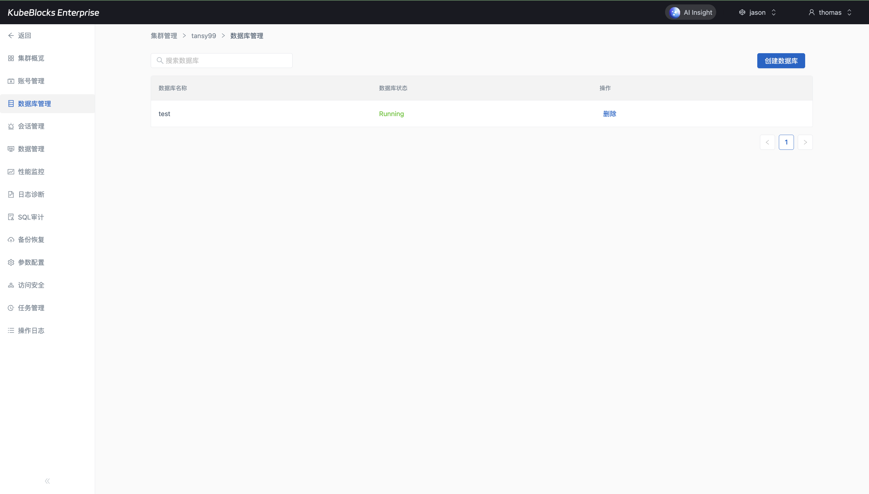 账号页和数据库页把访问主体与逻辑库对象留在同一工作区中,便于围绕应用接入做受控交付。