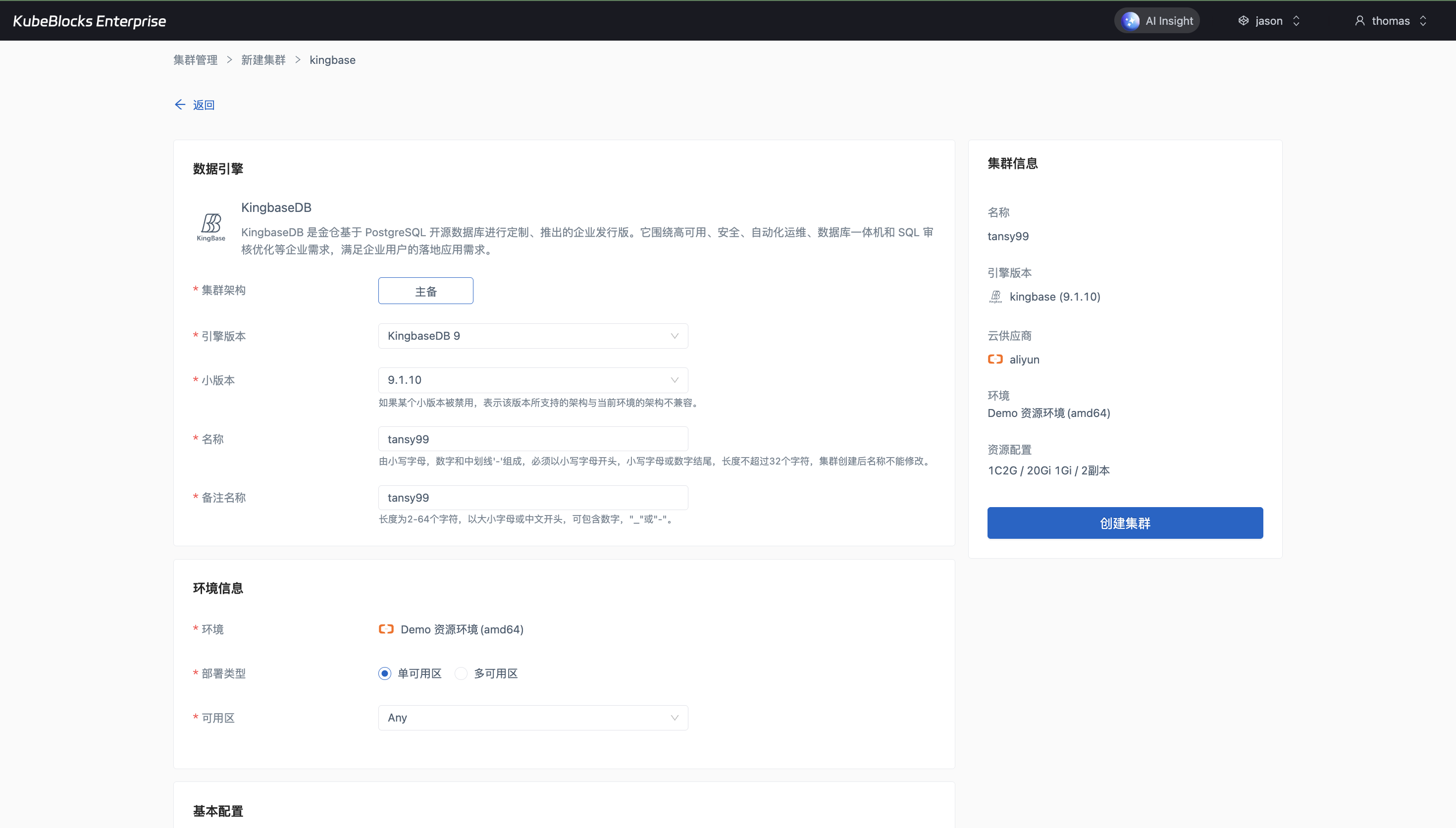 创建向导集中展示金仓版本、部署形态、算力和存储配置,适合作为国产数据库平台的标准交付入口。