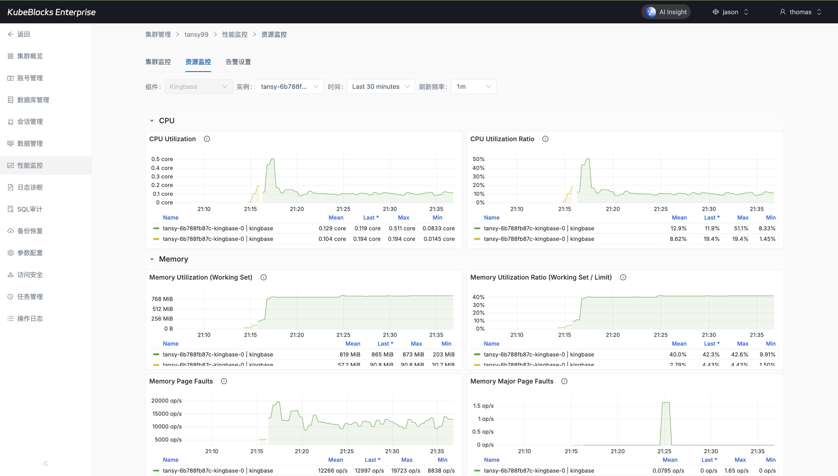 金仓 Addon 将指标监控纳入统一控制台中,帮助平台团队围绕实例性能和健康度持续观察运行状态。