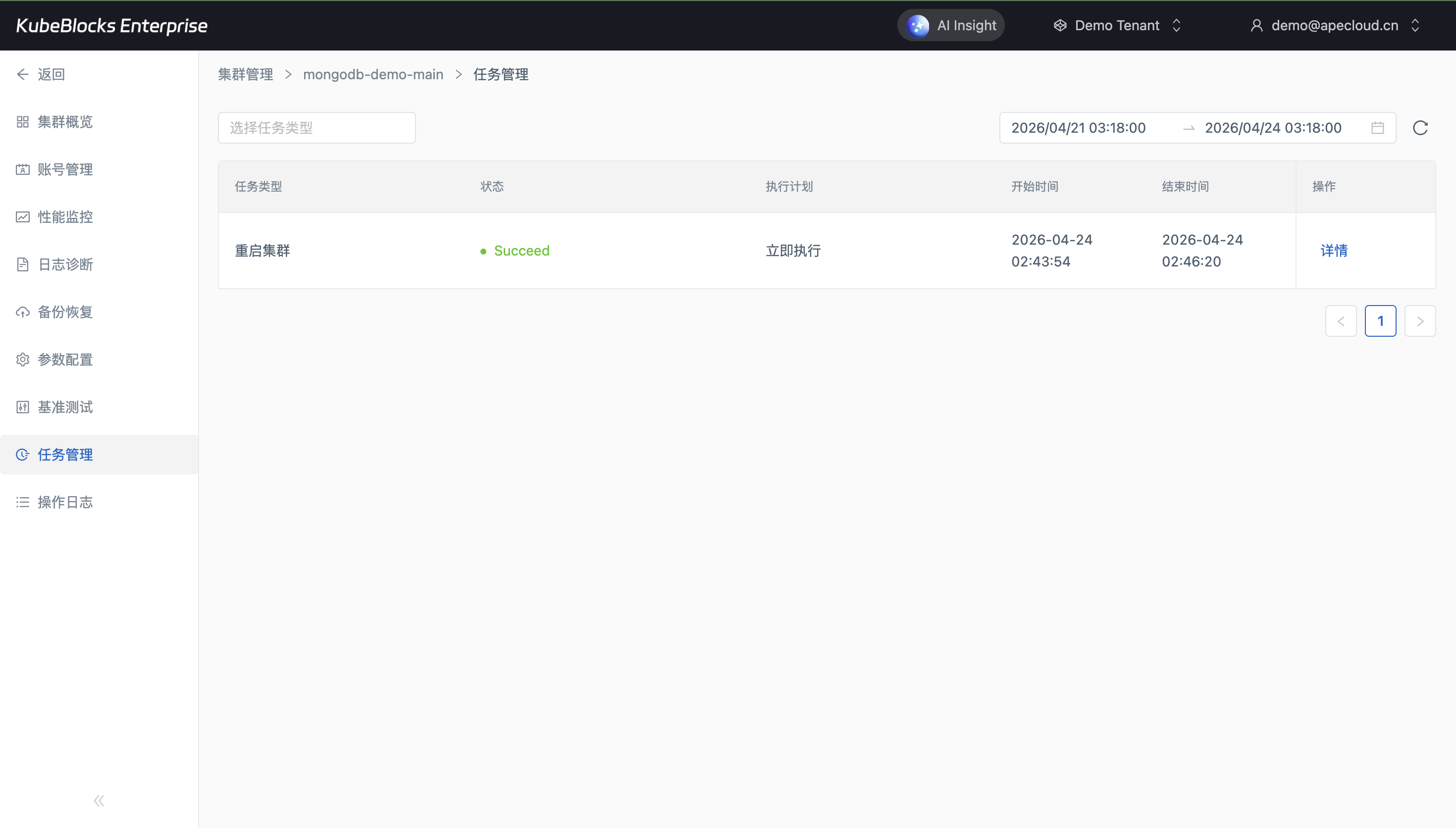 Tasks 页面沉淀 MongoDB 的扩缩容、切换和恢复等真实运维动作,帮助平台团队快速回看变更记录与执行结果。