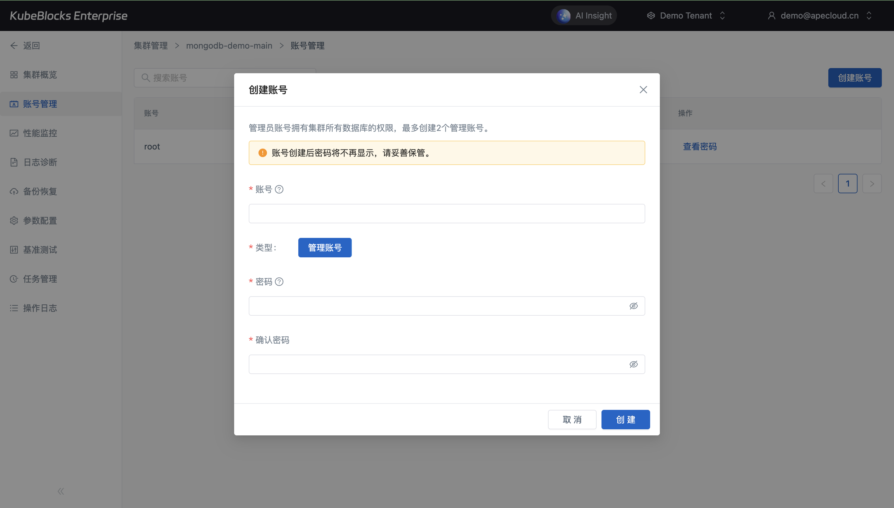 MongoDB Addon 目前以账号和角色管理作为主要的数据管理入口,便于平台团队围绕应用访问做统一授权。