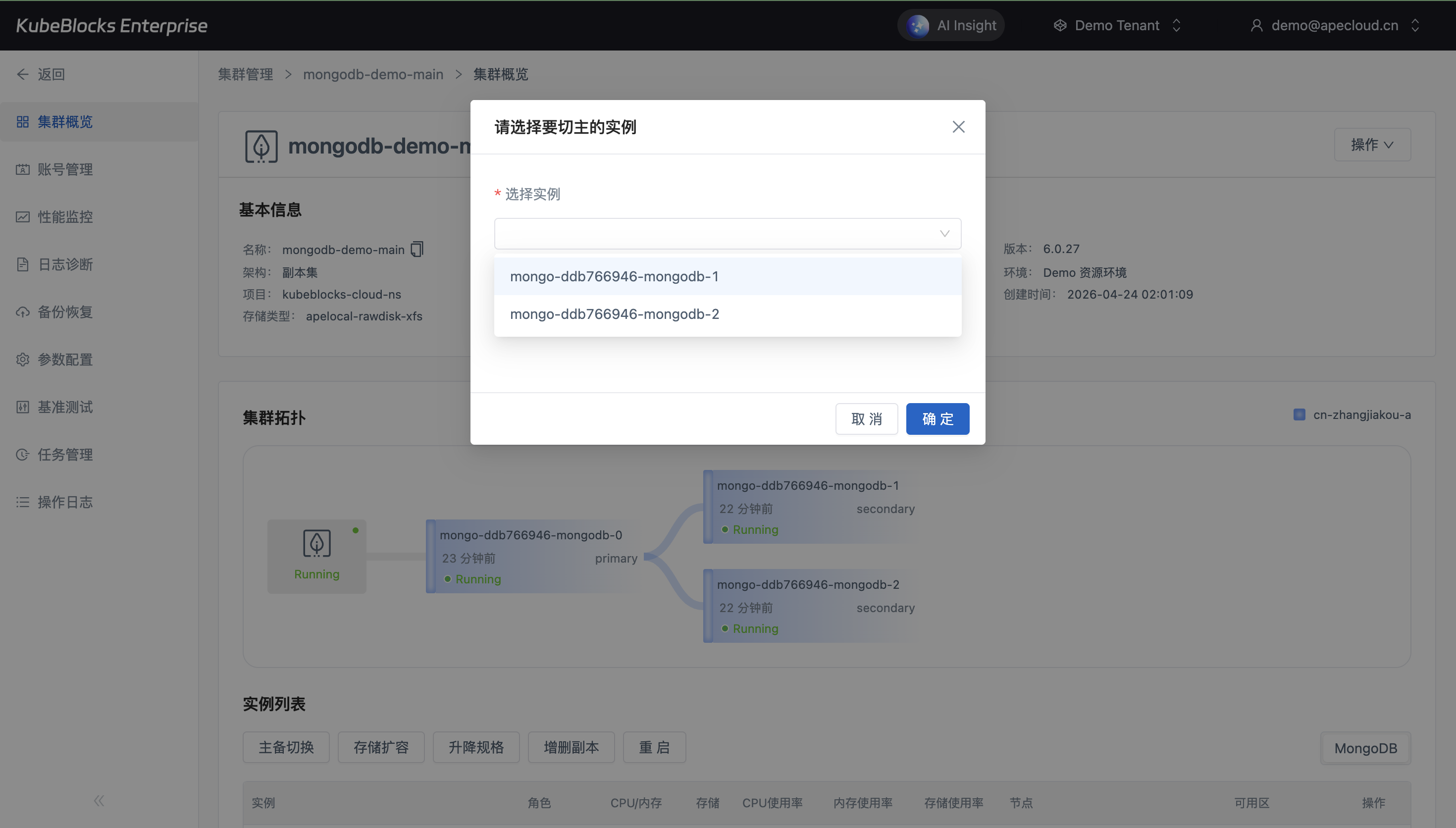 MongoDB Addon 在概览页直接提供主节点切换流程,让平台团队可以围绕当前 Primary 与目标 Secondary 发起计划内角色切换。