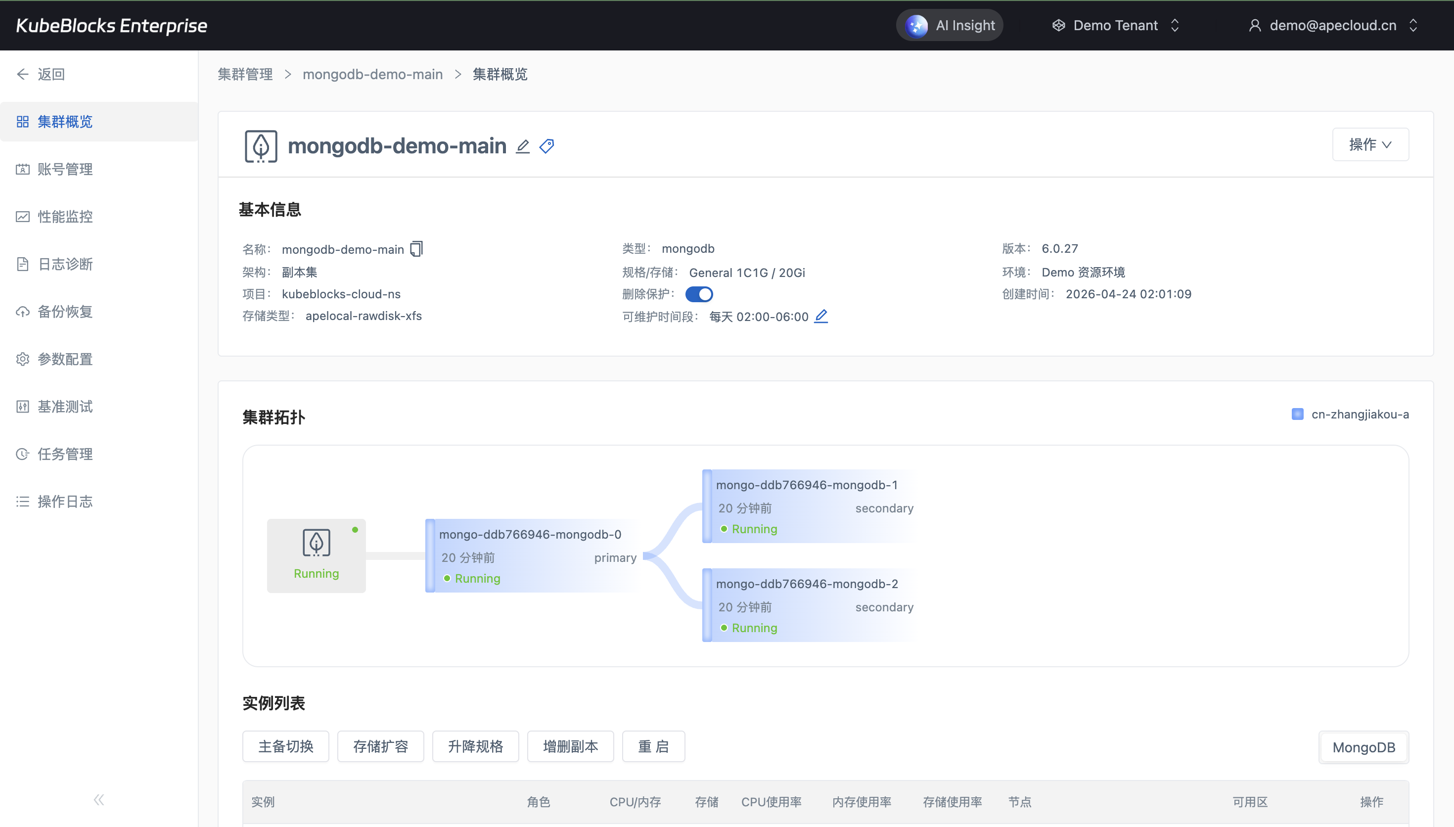 企业版 MongoDB Addon 拥有丰富的功能,完整覆盖了生命周期、高可用切换、垂直与水平扩容、参数调优、备份恢复、可观测性、合规审计和账号治理等场景。