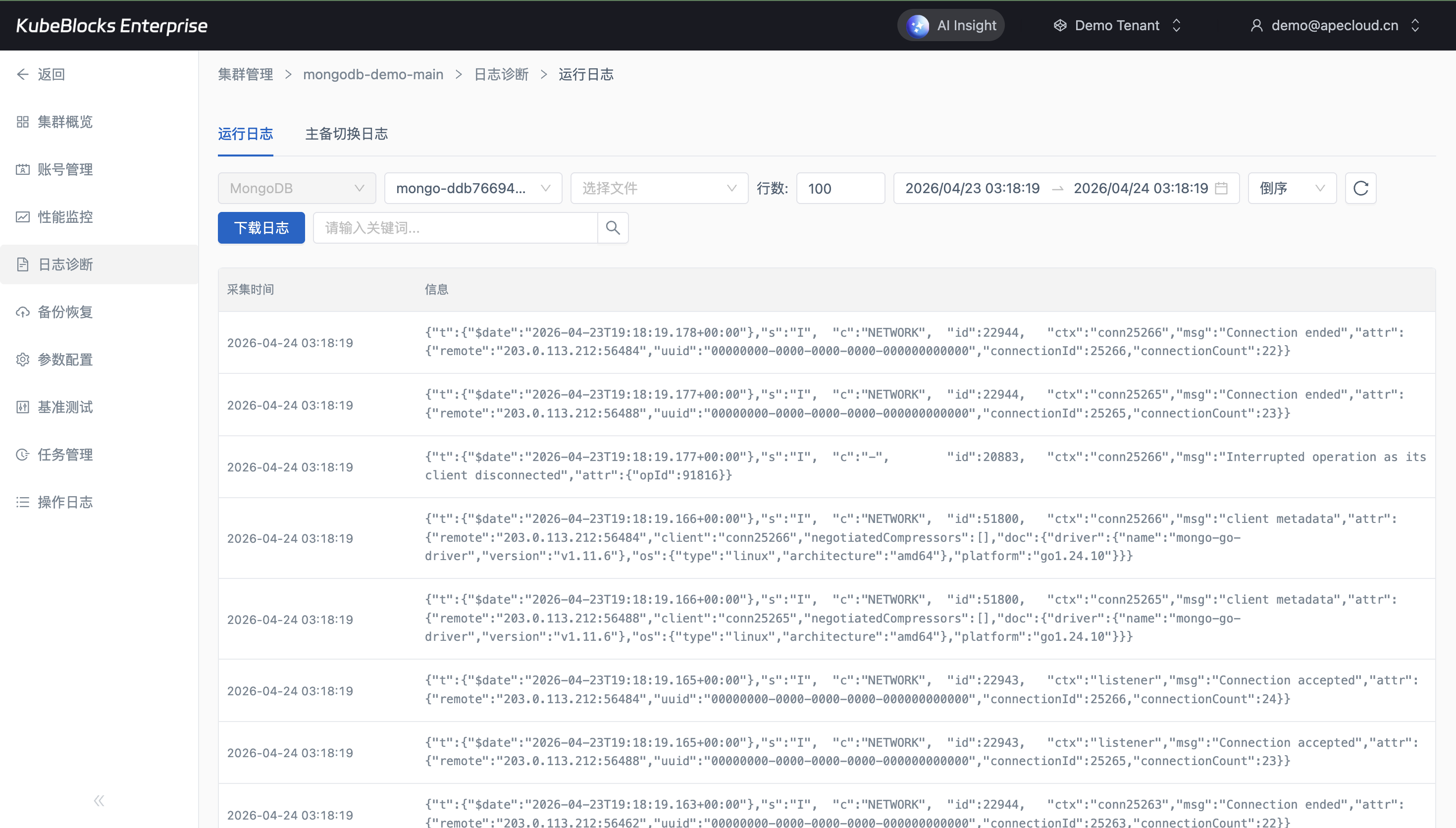 MongoDB Addon 将副本集状态和节点日志留在同一工作区中,让平台团队更容易围绕运行证据做巡检和故障定位。