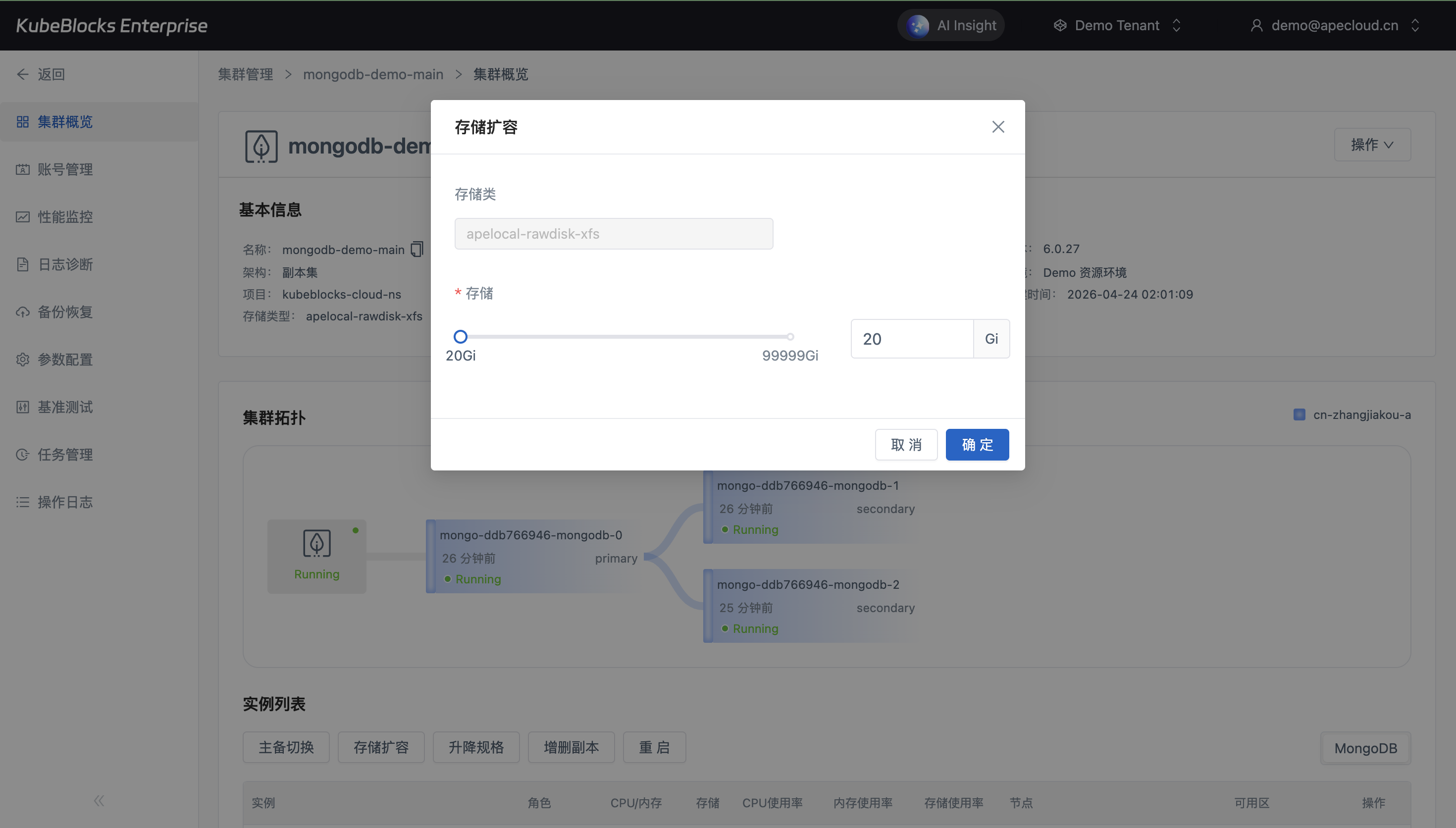 MongoDB Addon 将规格变更和存储扩容拆成明确的专用流程,让副本集容量演进在提交前就能清楚核对目标配置与容量变化。