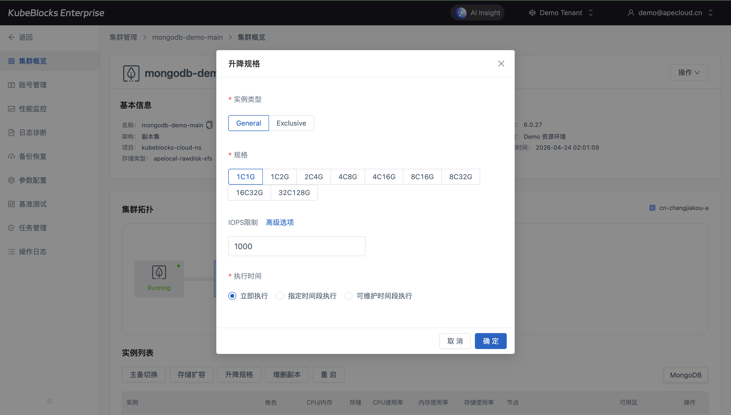 CPU、内存与容量变更都保留在 MongoDB 工作区中,减少跨系统切换。