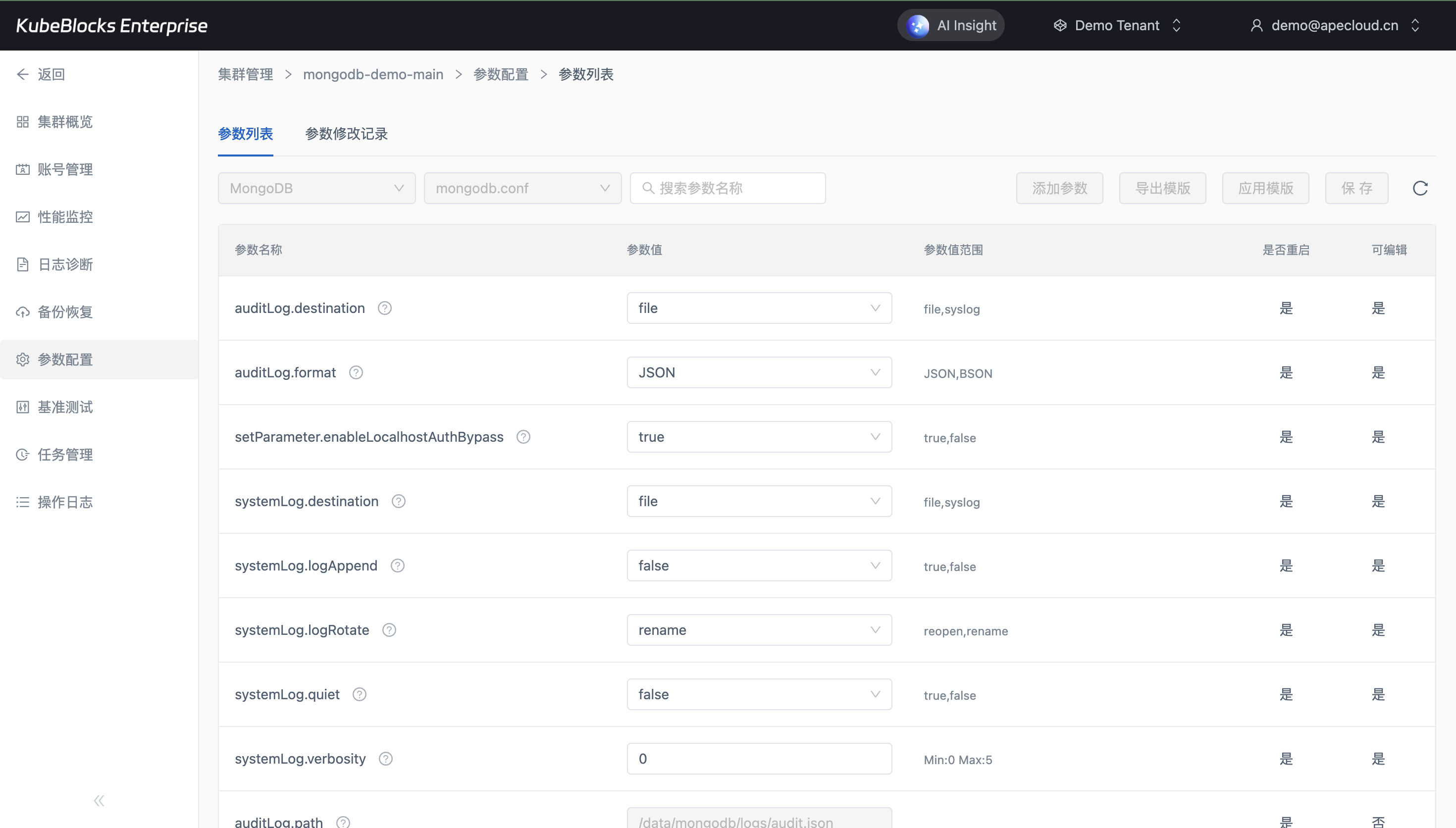 参数配置页面集中呈现 MongoDB 原生参数,方便平台团队围绕审计、日志和网络等关键配置执行统一调优。