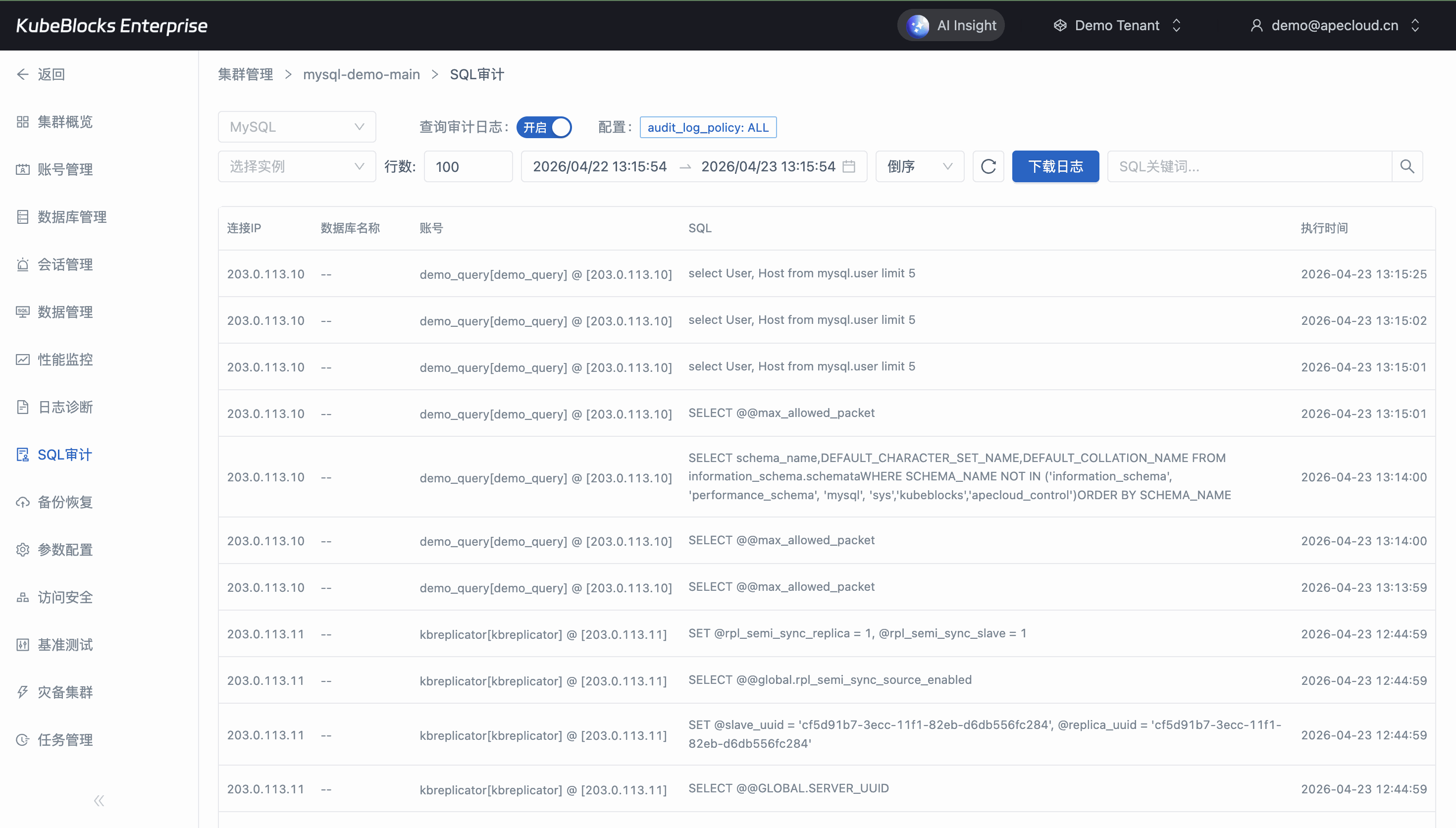通过 SQL Audit 查看执行语句与来源账号,满足审计和问题追踪需求。