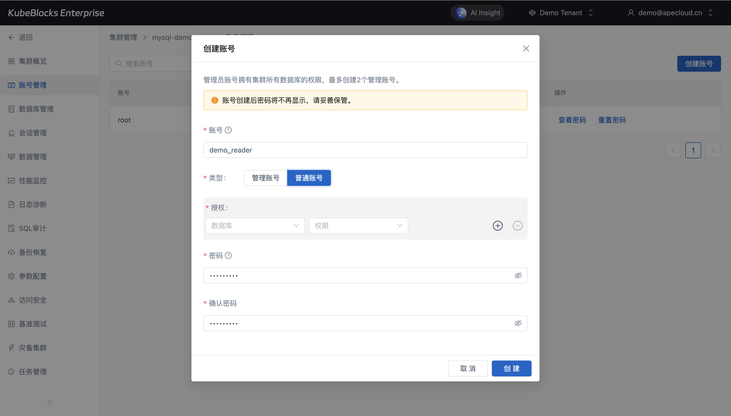 为应用创建 MySQL 账号并配置最小权限集,减少手工交付成本。