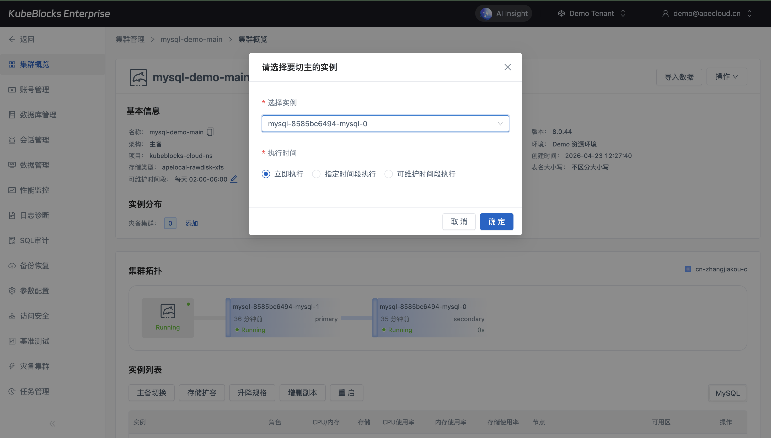 围绕当前主库、目标副本和切换后的角色布局发起 Switchover,把计划内切换做成可验证、可回看的高可用操作。
