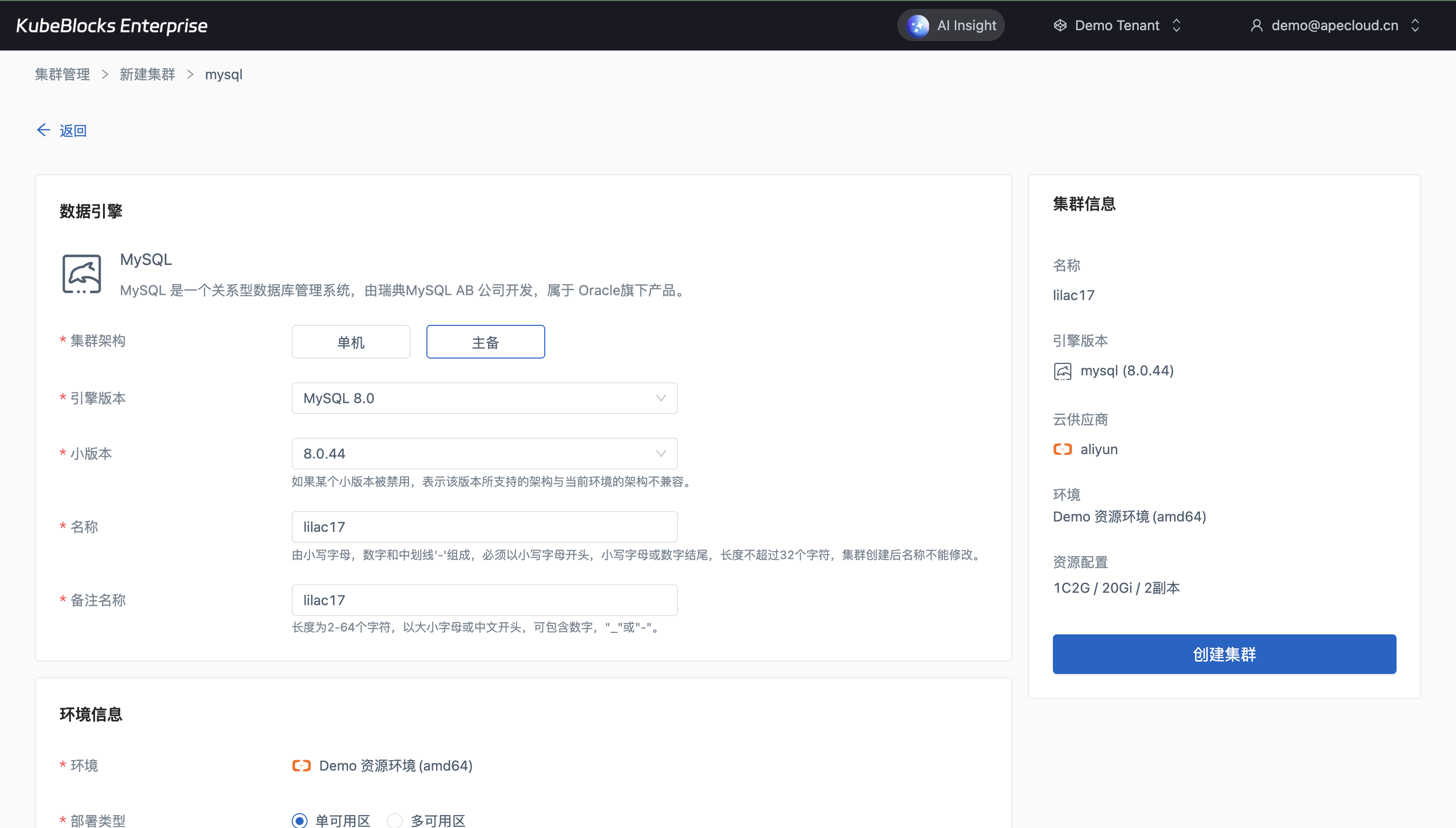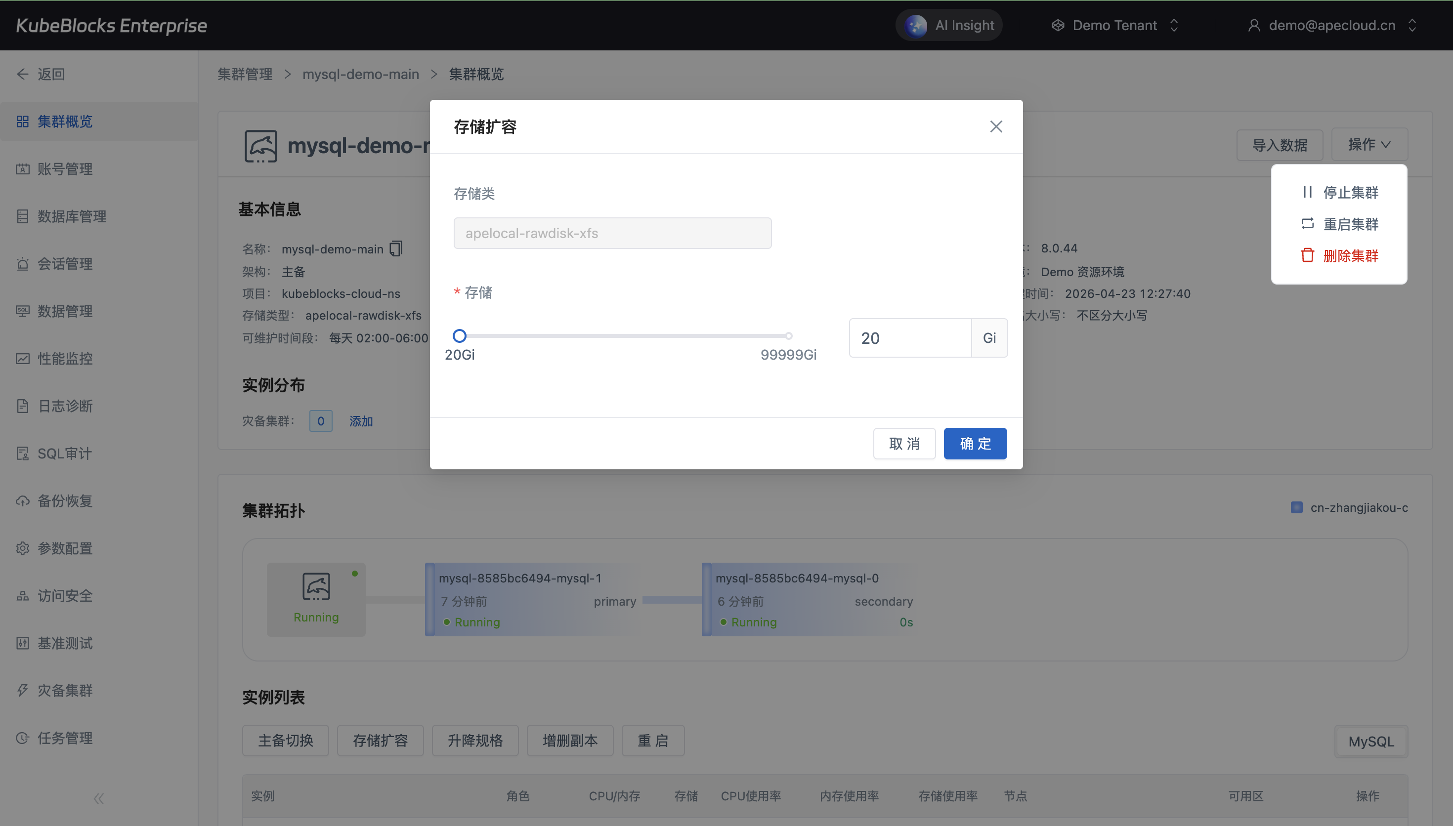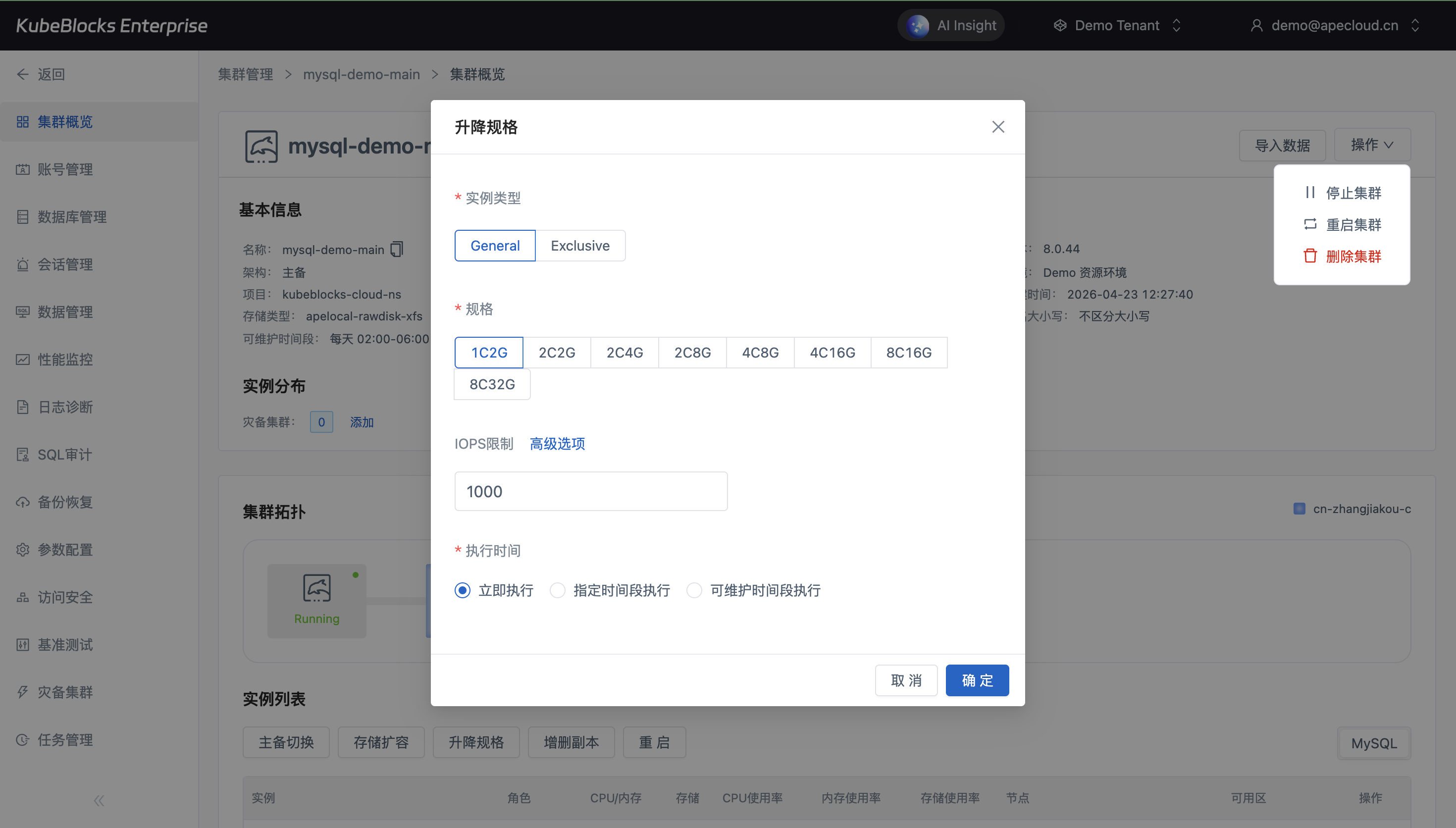 通过同一个工作空间完成 MySQL 集群创建与概览巡检,把版本、拓扑、计算资源、存储和备份策略集中在统一入口里管理。