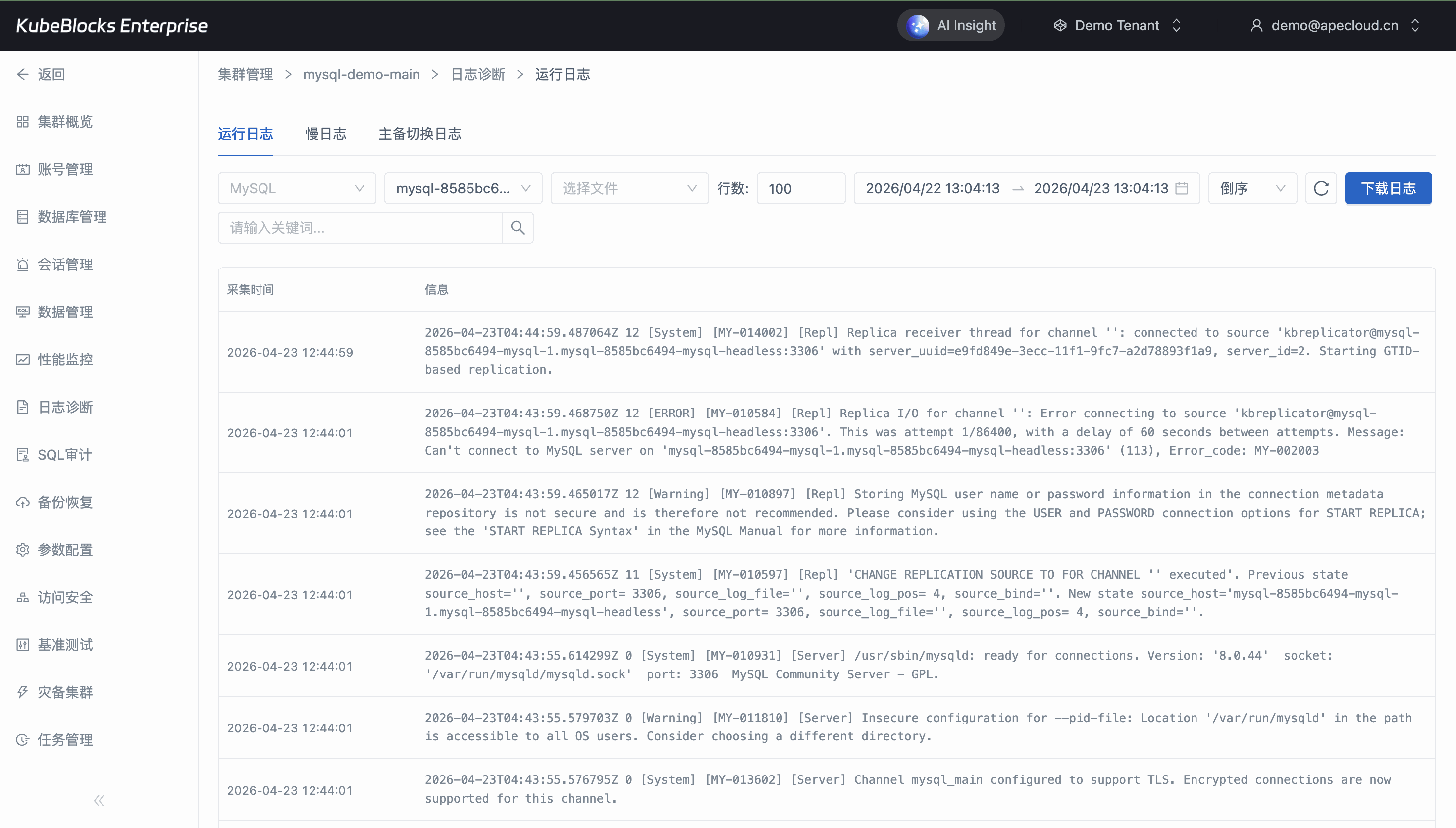 把性能监控、运行日志和慢查询分析收敛到同一个 MySQL 工作区,帮助团队在控制台中完成巡检和故障定位。