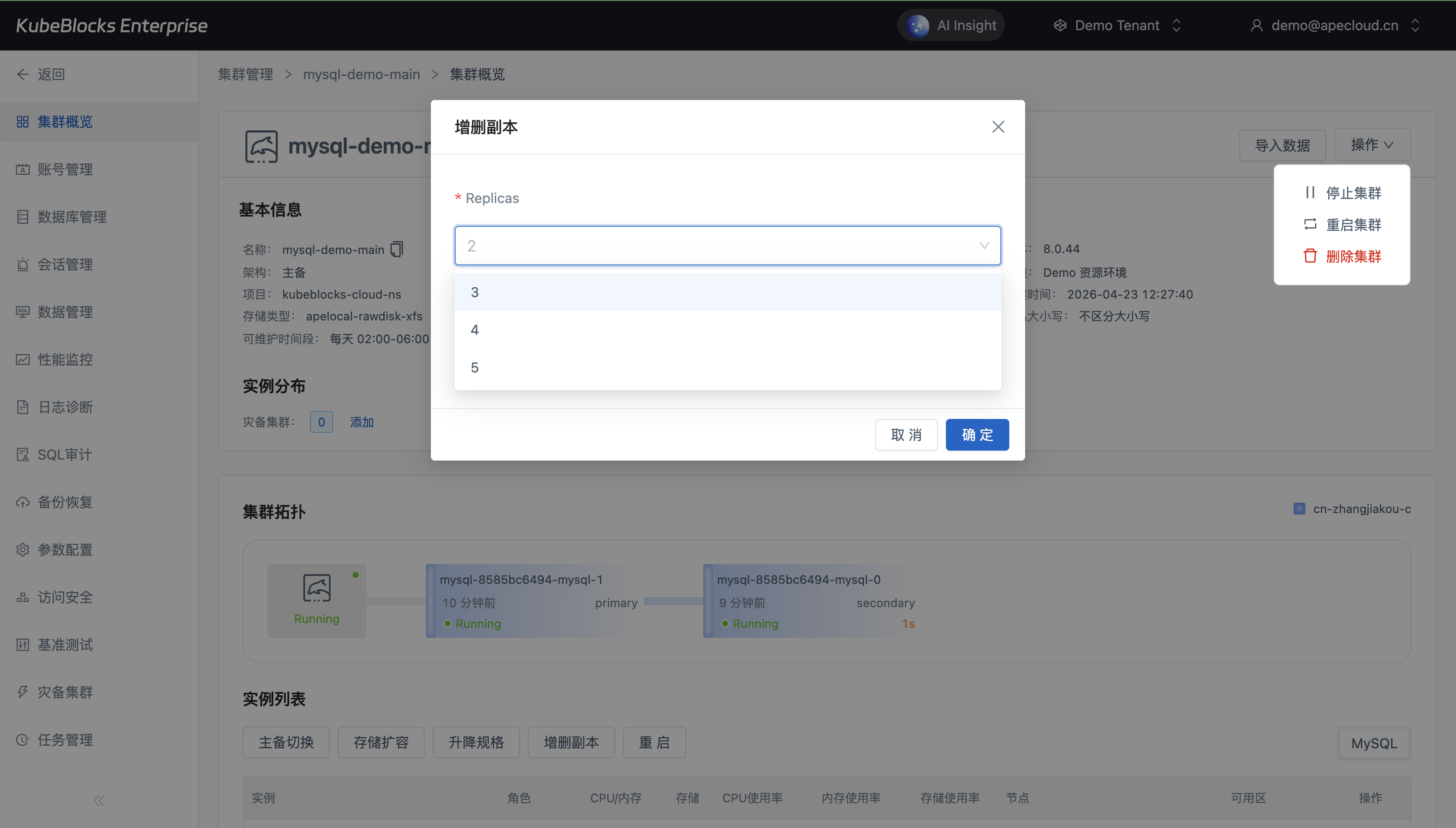 将副本横向扩展纳入专门的变更流程,在执行前明确展示目标副本数与受影响拓扑,便于团队按容量或高可用要求扩展集群节点。