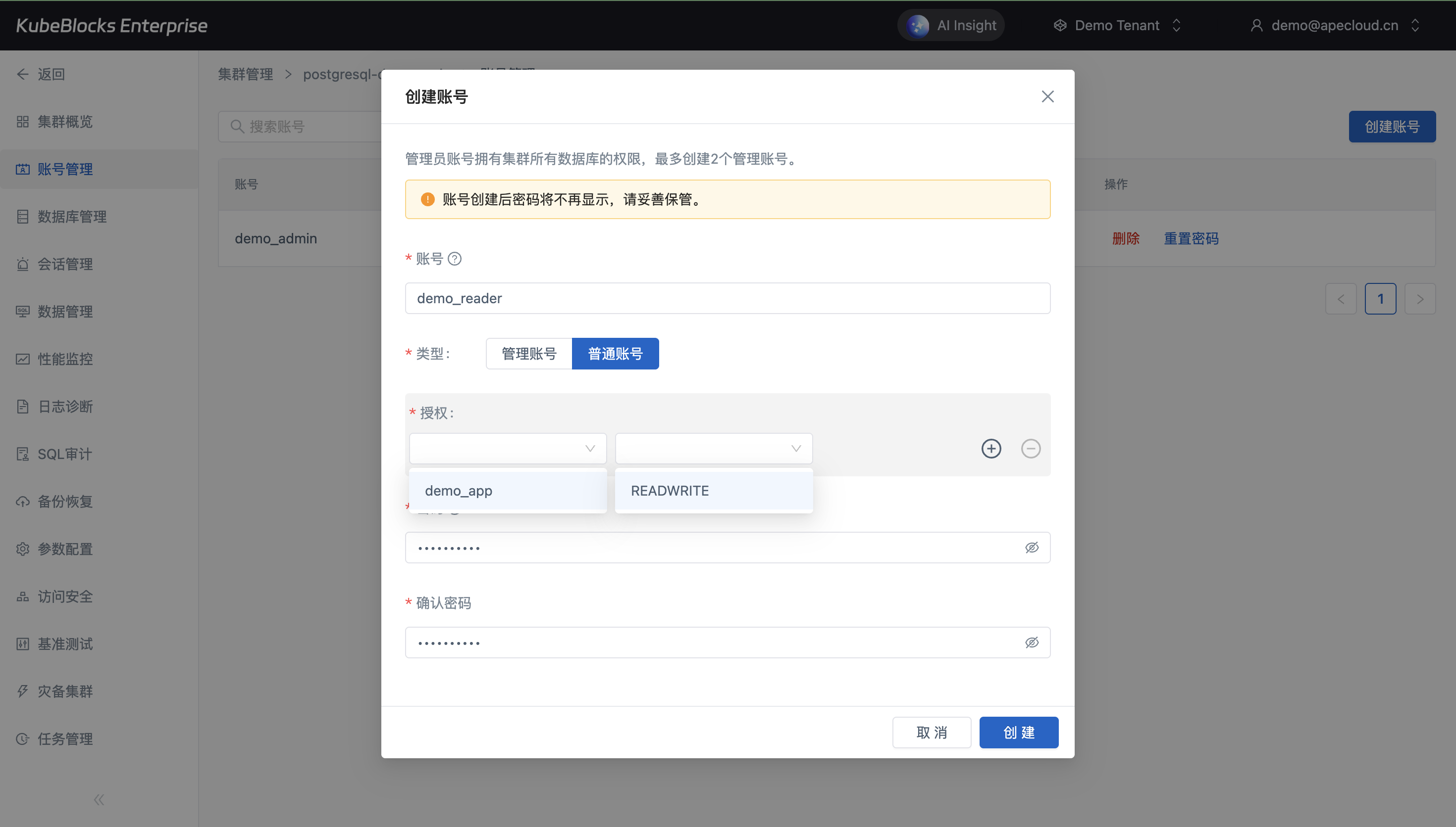 账号管理页支持平台团队创建 PostgreSQL 访问账号,并在同一工作区中查看权限配置。