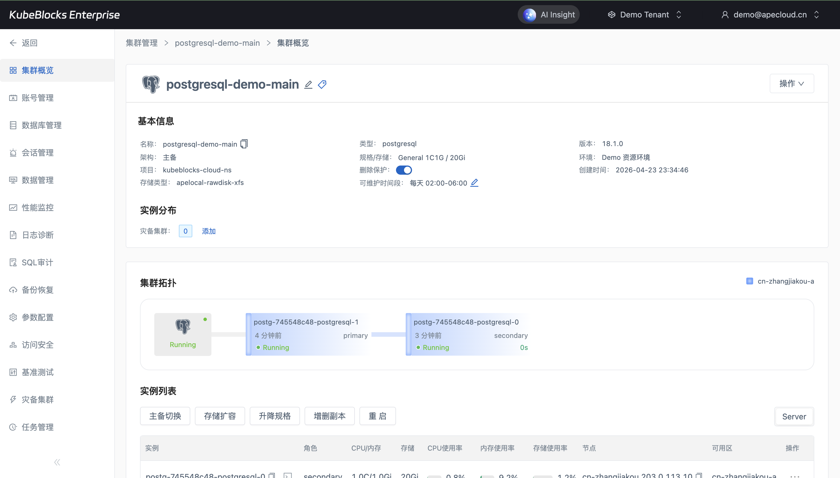 概览页同时展示运行状态、实例拓扑、连接方式与常用 Day-2 操作入口。