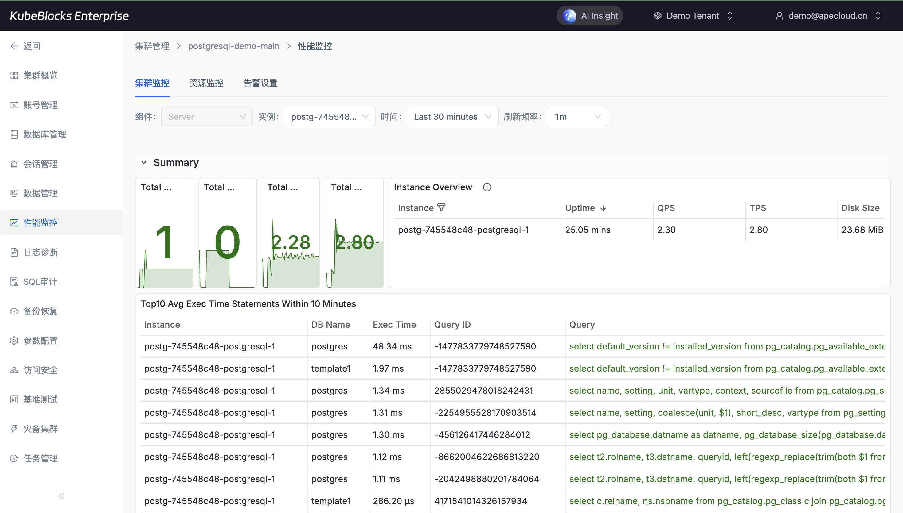 PostgreSQL Addon 将性能监控和日志定位保留在统一工作区中,帮助平台团队持续观察数据库健康度并缩短故障定位路径。