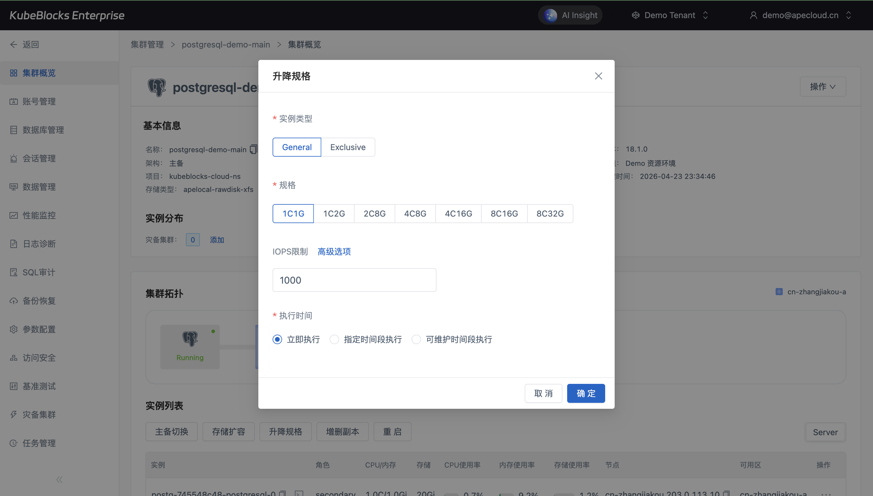 PostgreSQL Addon 将升降规格和存储扩容拆解为明确的专用流程,在提交变更前清楚展示目标配置和容量变化。